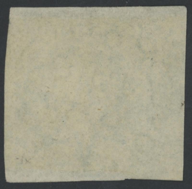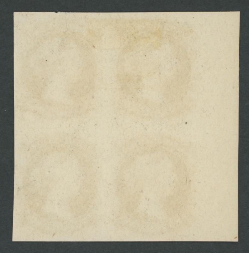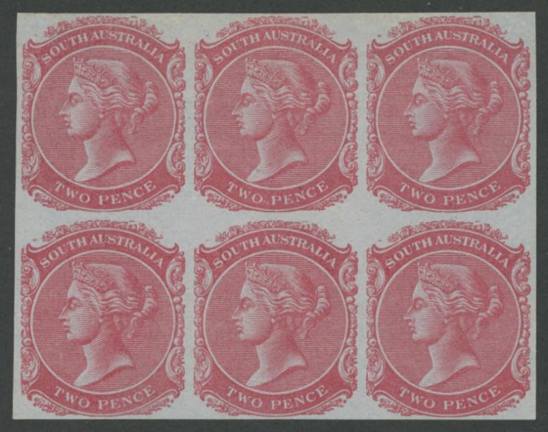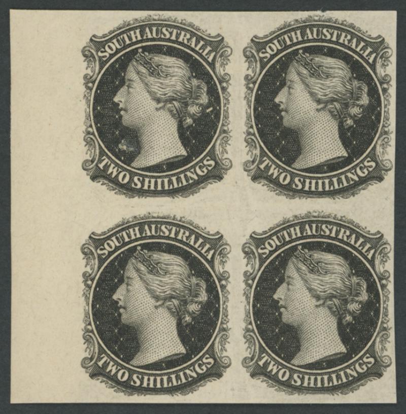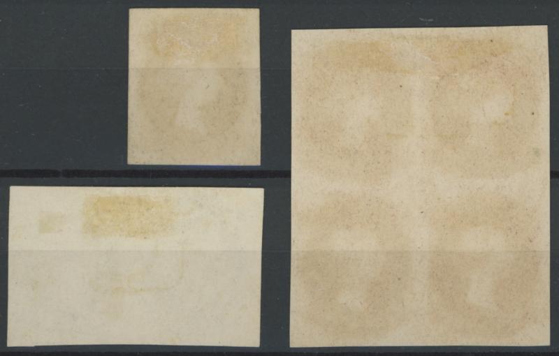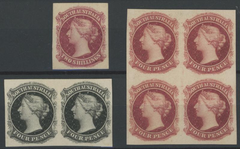 (close to the issued colour) with margins just shaved at lower-right to large; 2d Plate 2 single in dull carmine-lake with margins close to good; 6d block of 4 in deep blue (close to the issued colour) with margins just touching at upper-left to