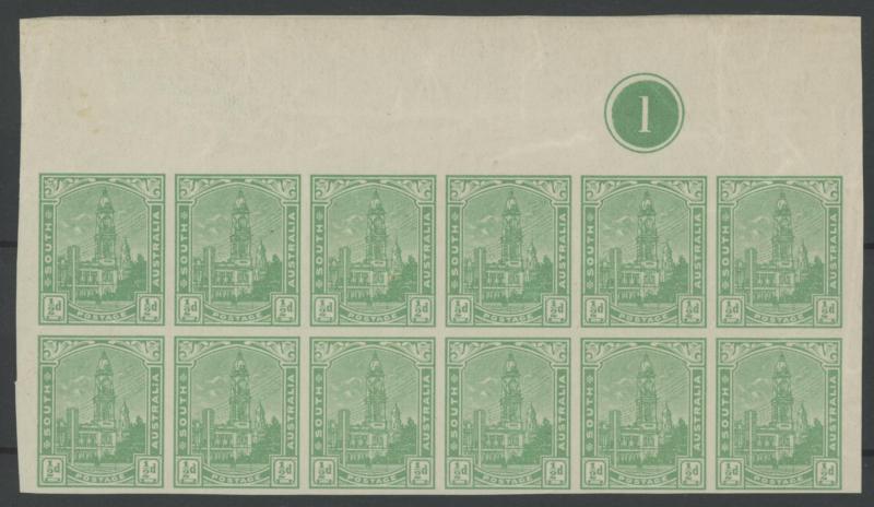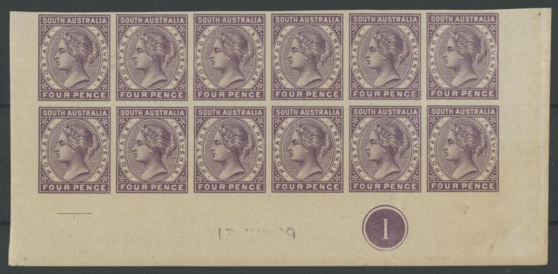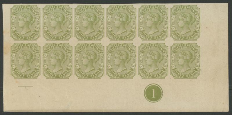 Pearce's collection), 1883-99 3d & 4d Plate Number '1' blocks of 12 in the issued colours both with suntanned gum (most units unmounted) and 1899 Post Office ½d Plate Number '1' block of 12 in blue-green (minor wrinkles, unmounted), also Crown/SA 2d