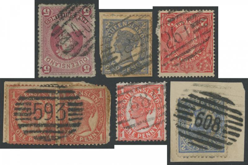 (RR), '401' on 5/- Chalon, superb '593' (RRR) x2, '595' (RR), superb '608' (RRR), '686' (RRR), etc, also Railway Numeral '896' (unrecorded). Many others misidentified or wildly optimistic.