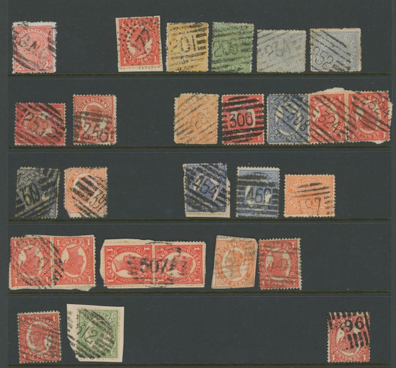 NUMERAL CANCELS: Useful selection mostly on QV Sidefaces including '189' (rated RRR), '252' (RR), '267' on KGV 1d red (RRR), '397'