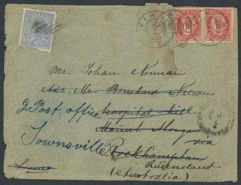 1892 (Oct 7) commercial cover from Norway with Posthorn 10o pair tied by 'LARVIK' cds, to a Norwegian miner at Mount Morgan
