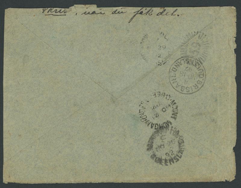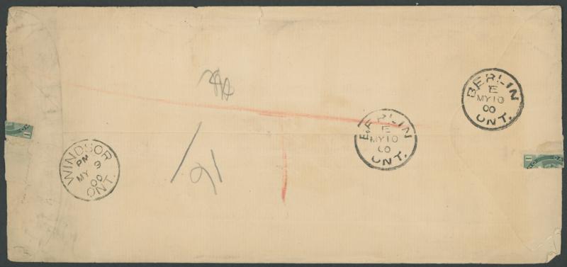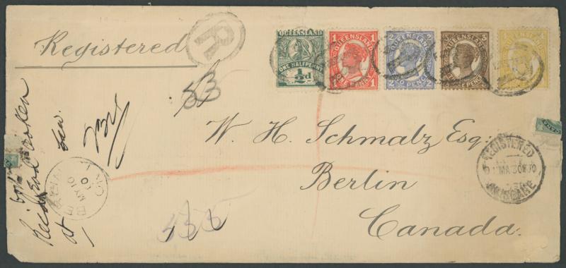 'R'-in-oval handstamps with 'REGISTERED/BRISBANE' cds below, Canadian endorsement "Recd both end broken at" & 'BERLIN/MY10/00/ONT' cds and resealed at both ends with portions of a Canadian QV 1c blue-green stamp!, minor peripheral tears. A remarkable