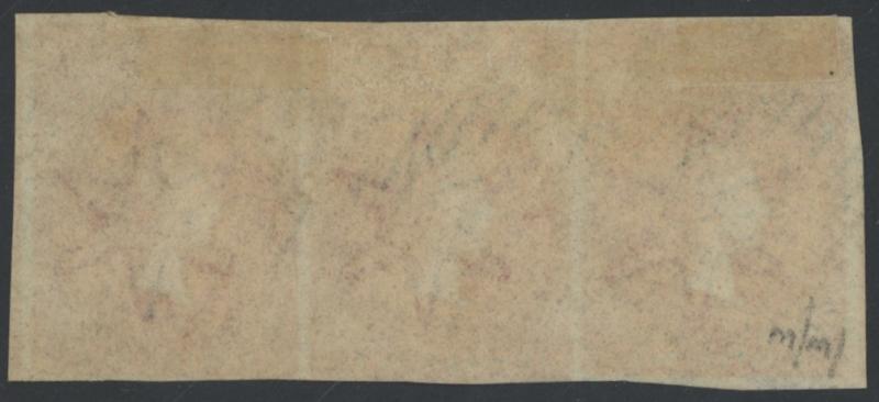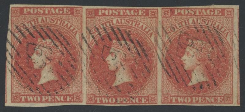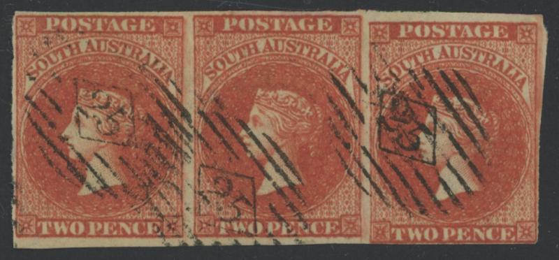 1856-58 QV Perkins Bacon Adelaide Printings 2d orange-red SG 7 horizontal strip of 3, full margins except at the base of the last