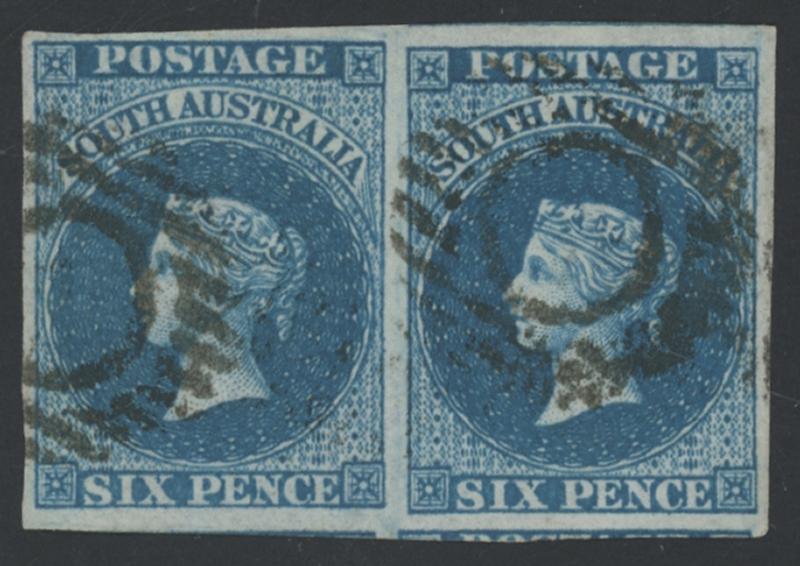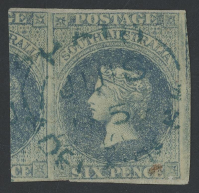 1856-58 QV Perkins Bacon Adelaide Printings 6d slate-blue SG 10, margins just touching at lower-left to huge with a fragment of the