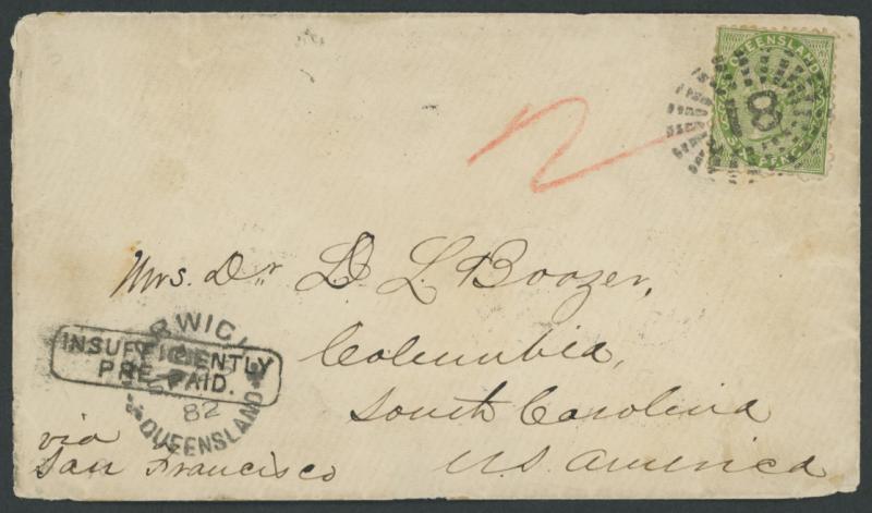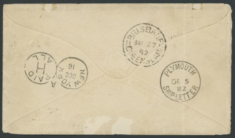 '81' Numeral-in-Rays and very fine 'WARWICK/QUEENSLAND' unframed cds with fleurons at lower-left over-struck by very fine 'INSUFFICIENTLY/PRE-PAID' rounded-boxed handstamp applied above the endorsement, Brisbane & 'PLYMOUTH/DE 5/82/SHIP-LETTER'
