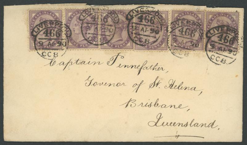 lilac x6 tied by five fine to very fine strikes of 'LIVERPOOL/466' Hooded-Circle datestamps, small-part Brisbane arrival backstamp only as part of back flap missing & minor edge faults. The buildings on St Helena Island in Moreton Bay were