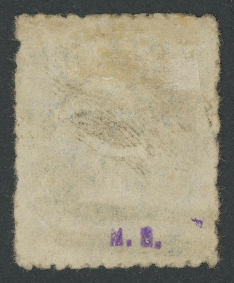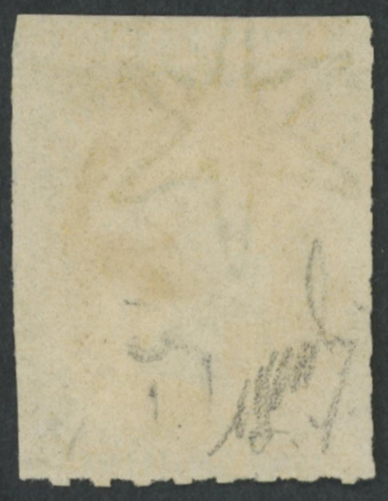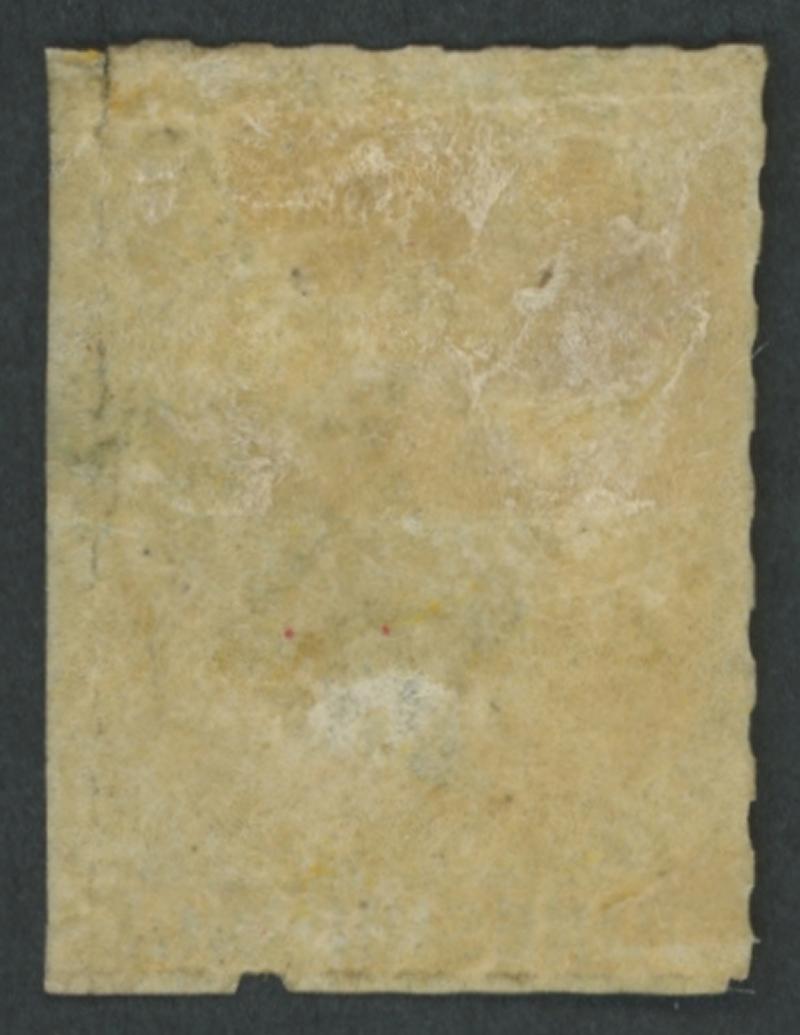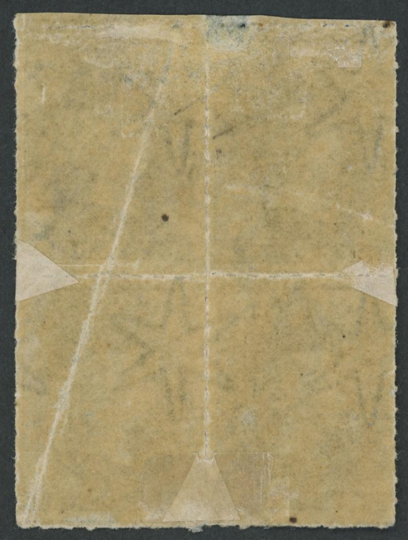 large-part but desiccated gum, Cat £1600. A rare stamp. Superior to the 'Besancon' (III) example - rounded corner at upper-right & redistributed gum - that sold for SFr1570. In 'Shilling Violet' of Dec 1991, Don Pearce wrote that "discolouration of