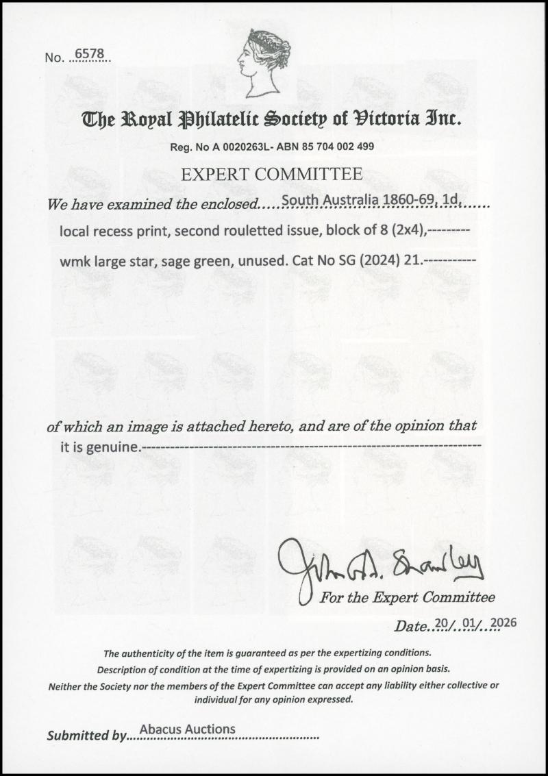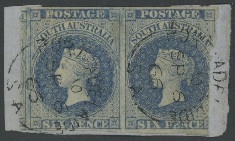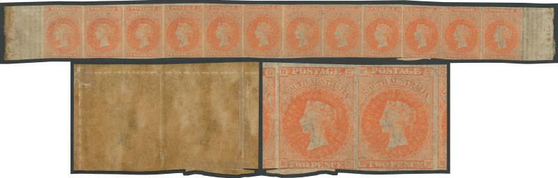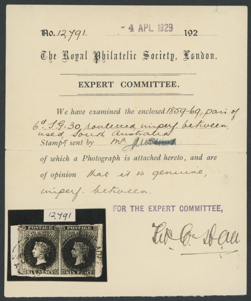 apparently damaged but it has been separated along the vertical rouletting, the extrusion at upper-right being an aberration, both units tied to a small piece by very fine 'PORT ADELAIDE/SP6/66/SA' cds, Cat £9500. One of the major errors of South