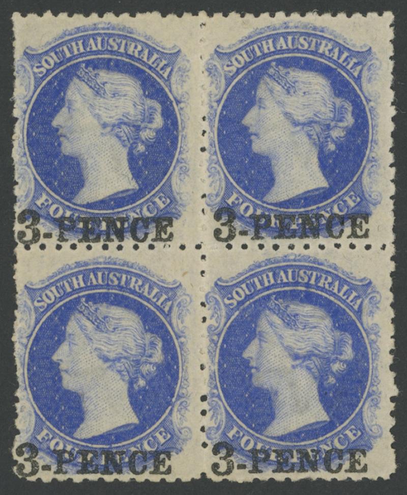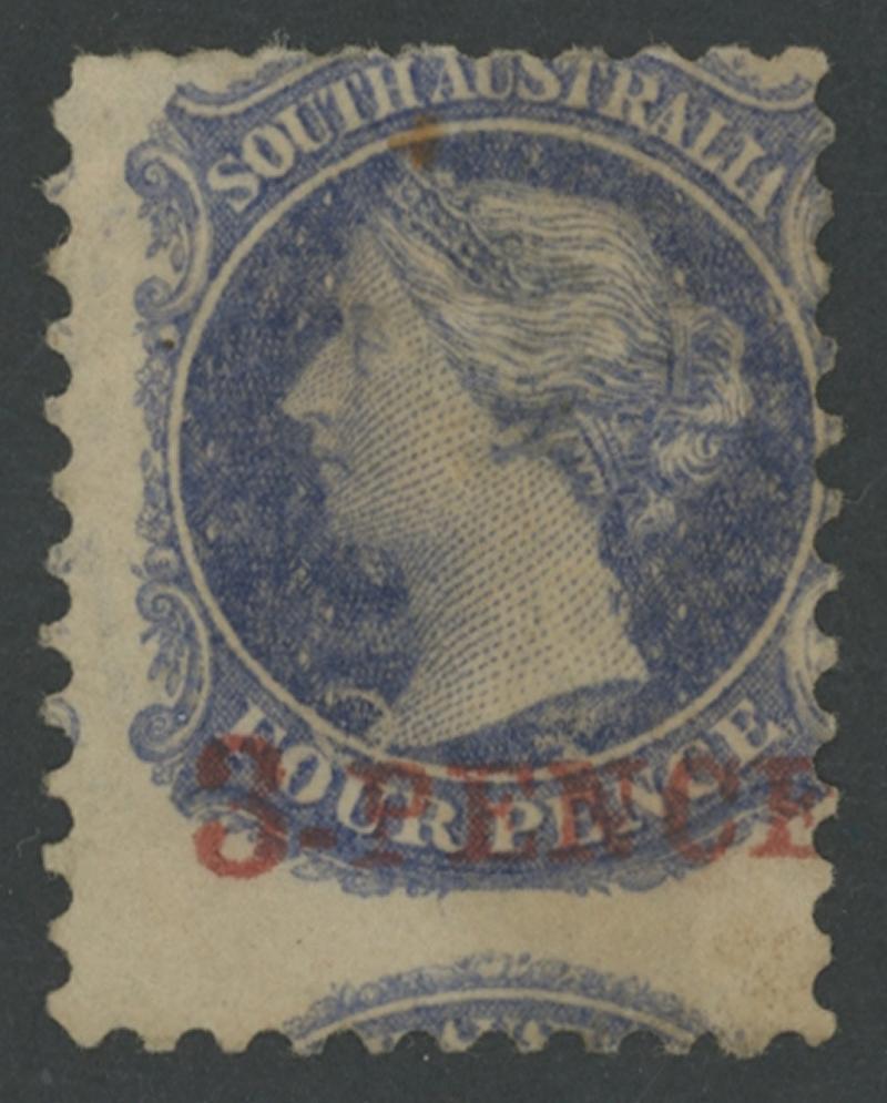 famous stamp error, then following close behind is the South Australia '3-PENCE' on 4d with the Surcharge Omitted...[which] created the 4d ultramarine Error of Colour.' (Image1) (Image2)