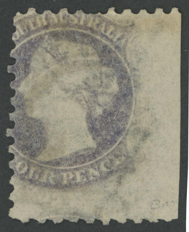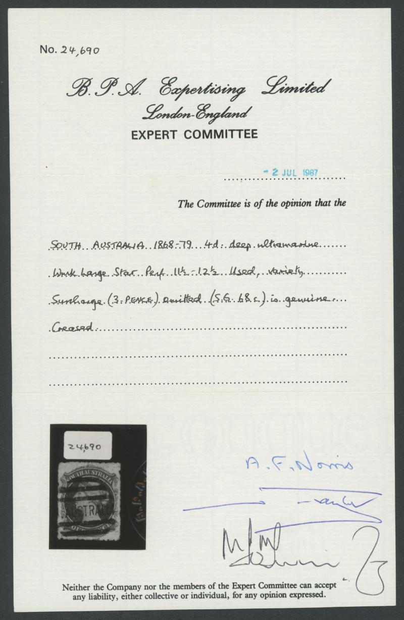 Creased', which is harsh. Dr Don Pearce's example with minor separation faults sold for $44,840 (Sale 249 Lot 1143). Gary Diffen's very fine example sold in 2020 for £44,000.The 4d with Surcharge Omitted is the great rarity of South Australia. Only