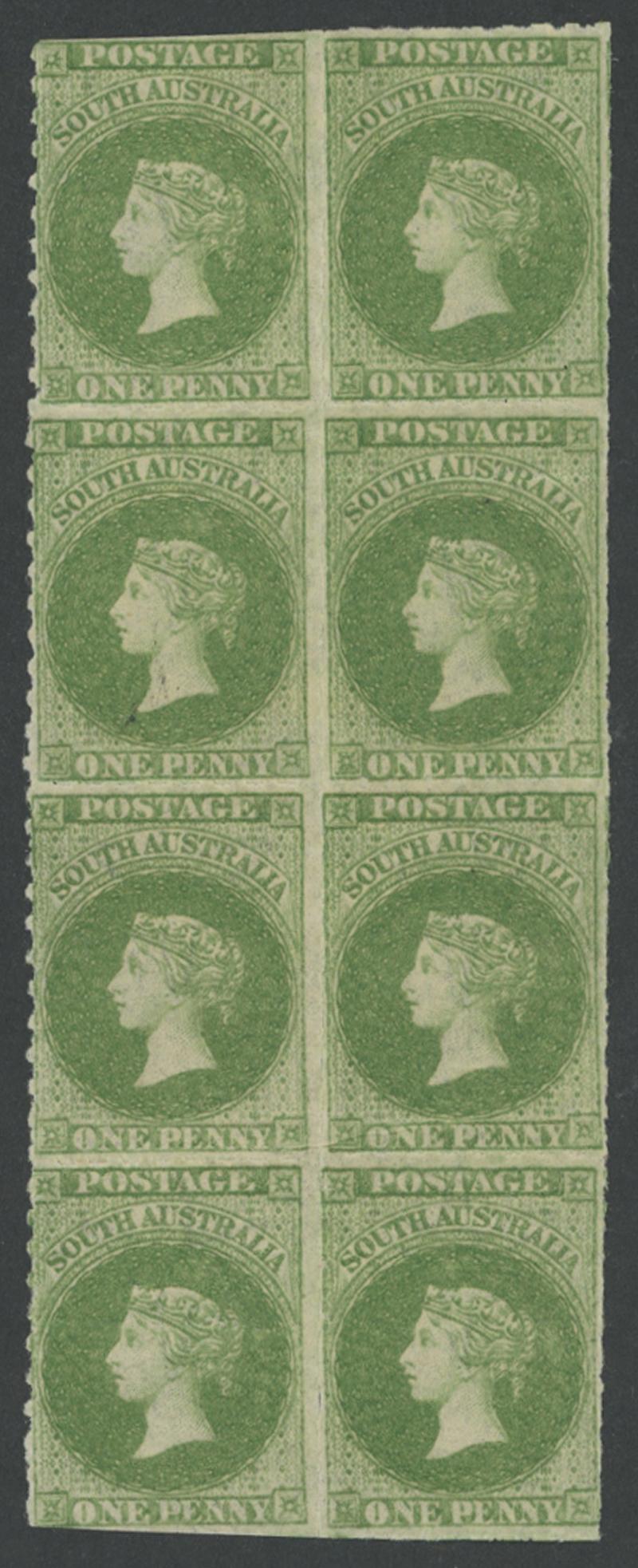 1860-69 Second Rouletted Issue 1d sage-green SG 21 block of 8 (2x4), full rouletting and remarkably well-centred, cut from the
