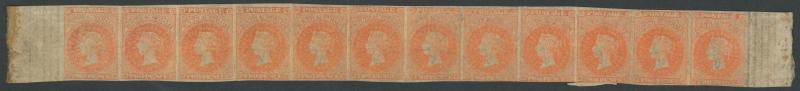 1860-69 Second Rouletted Issue 2d bright vermilion SG 26 complete strip of 12 with margins at left & right, full rouletting -