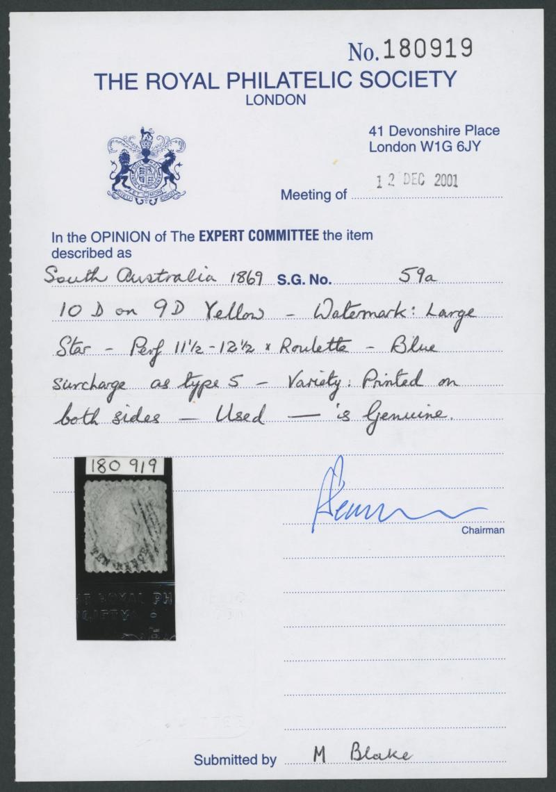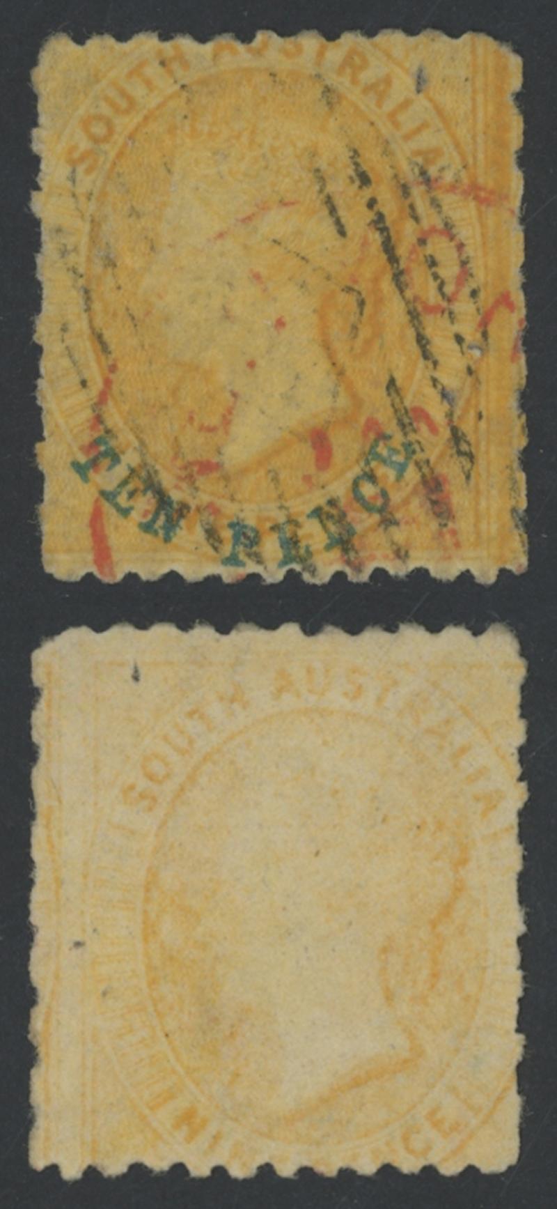 upright relative to the face, unframed 'PORT ADELAIDE/73/OC10/ A /S A' cds, minor shallow thins, Cat £1000. Chris Ceremuga Certificate (2018). Remarkably, both impressions are unusually well-centred, making this a very desirable example. Usage at the