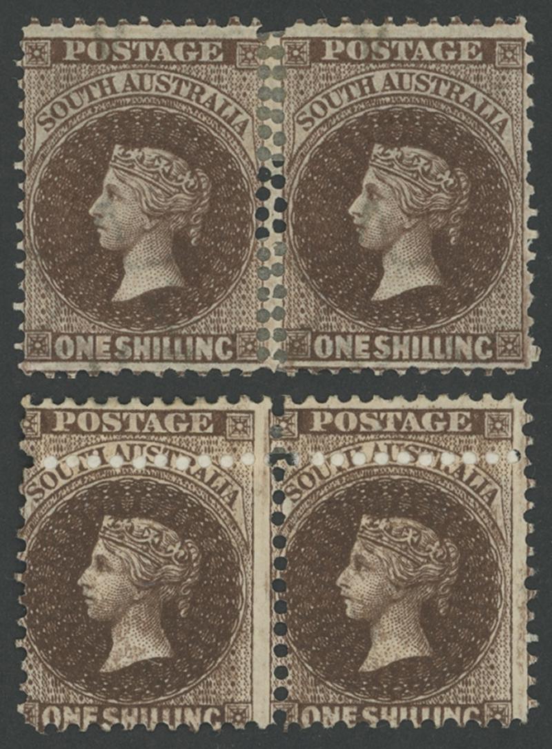 1876-1900 QV Perkins Bacon Broad Star Watermark Perf 11½-12½ 1/- chocolate with Large Perforation Holes SG 130 two horizontal pairs