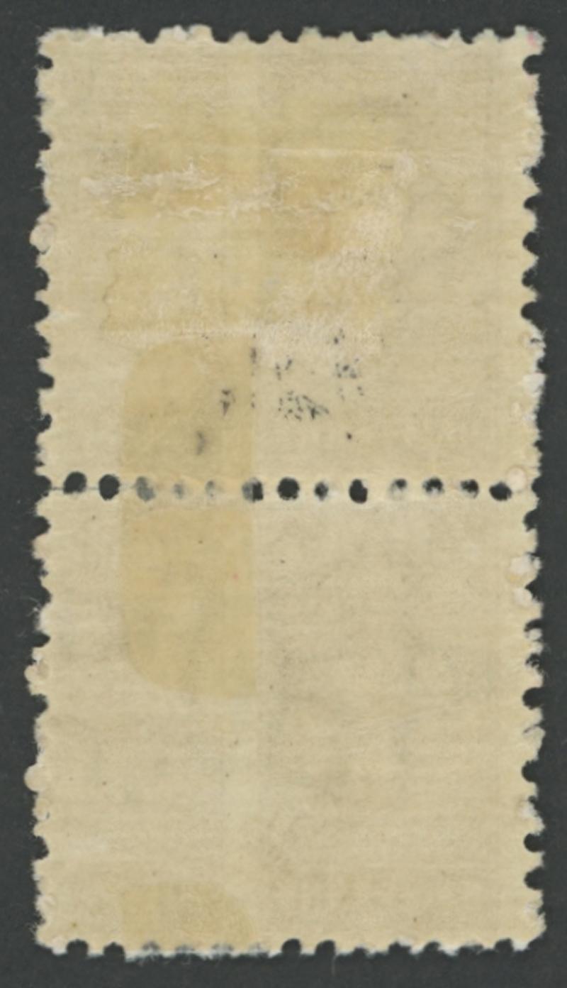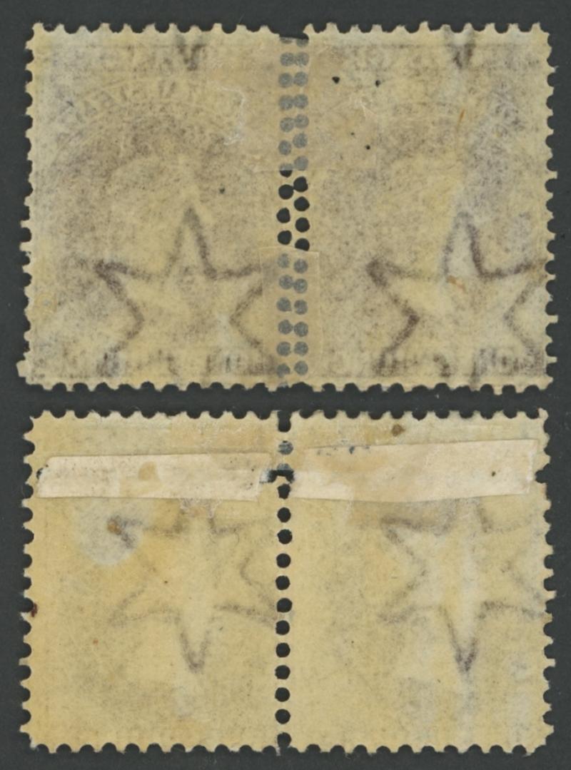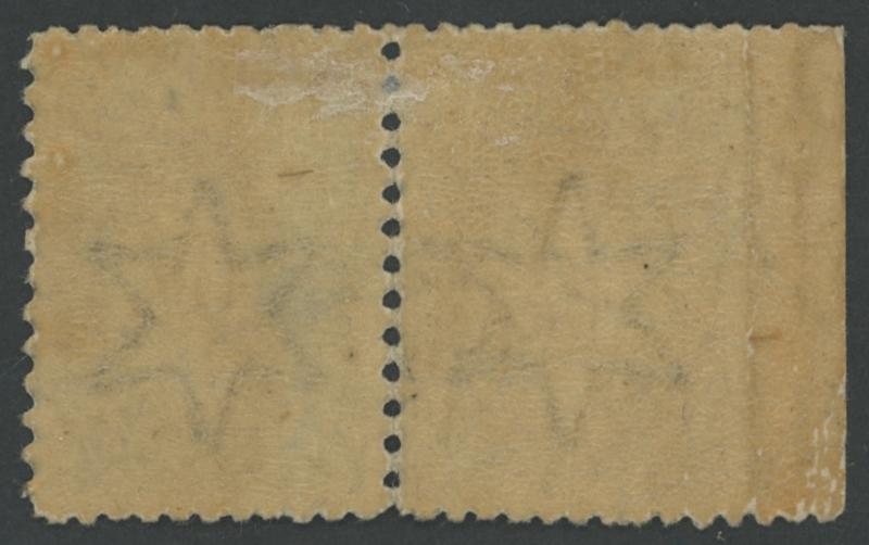 the vertical perfs at right misplaced into the designs, large-part gum, Cat £3500+ for two pairs. Ex Don Pearce: sold for $1555 (Sale 249 Lot 1306). Rare: possibly only one other pair recorded, similarly mis-perforated at right. (Image1) (Image2)