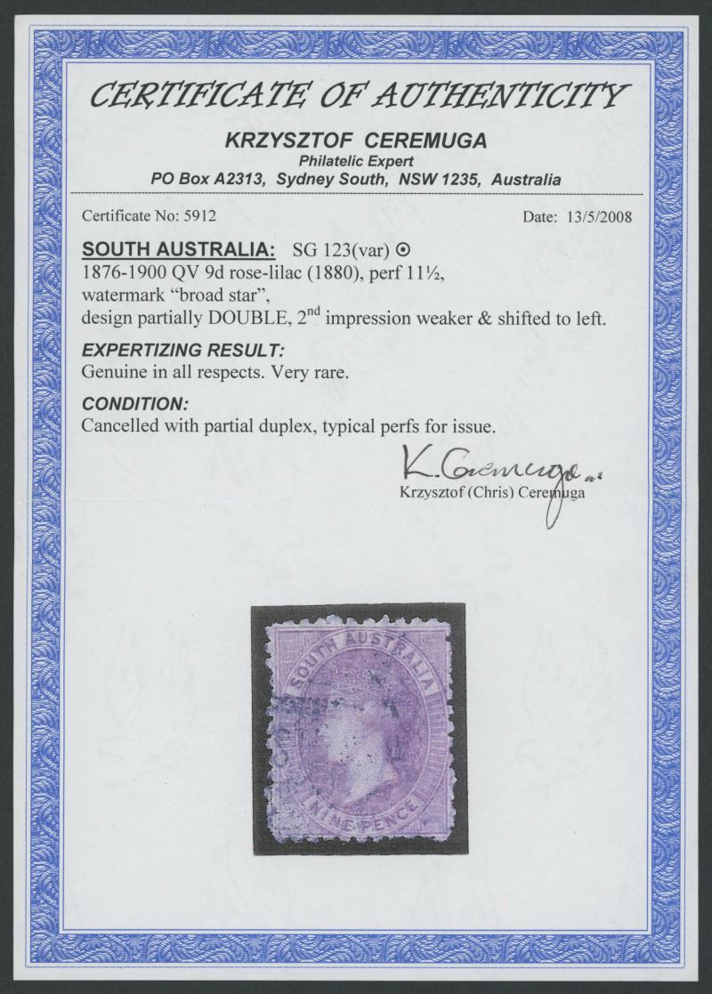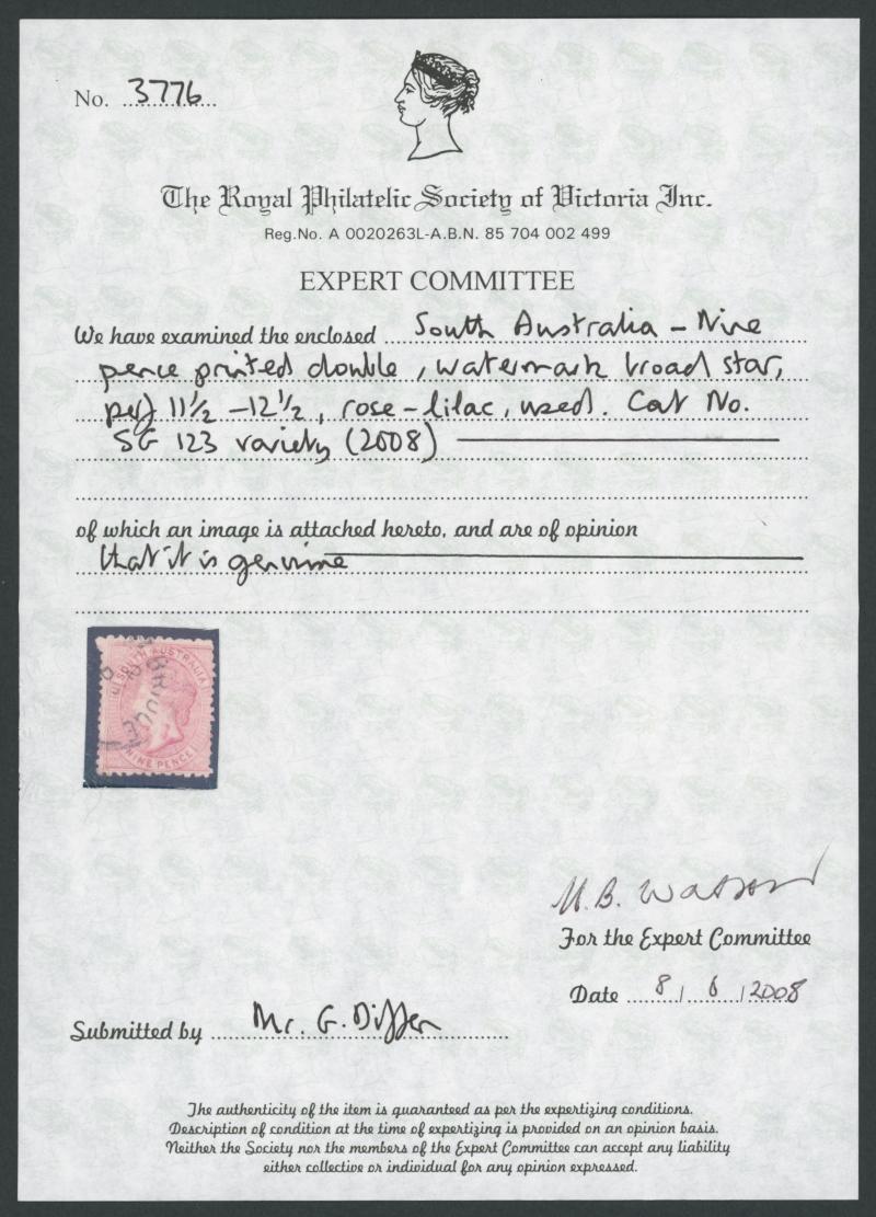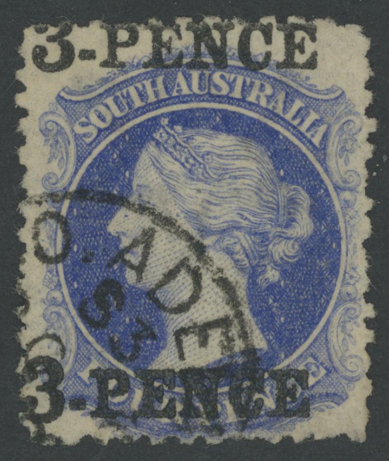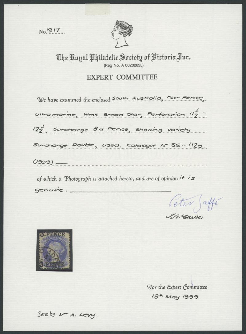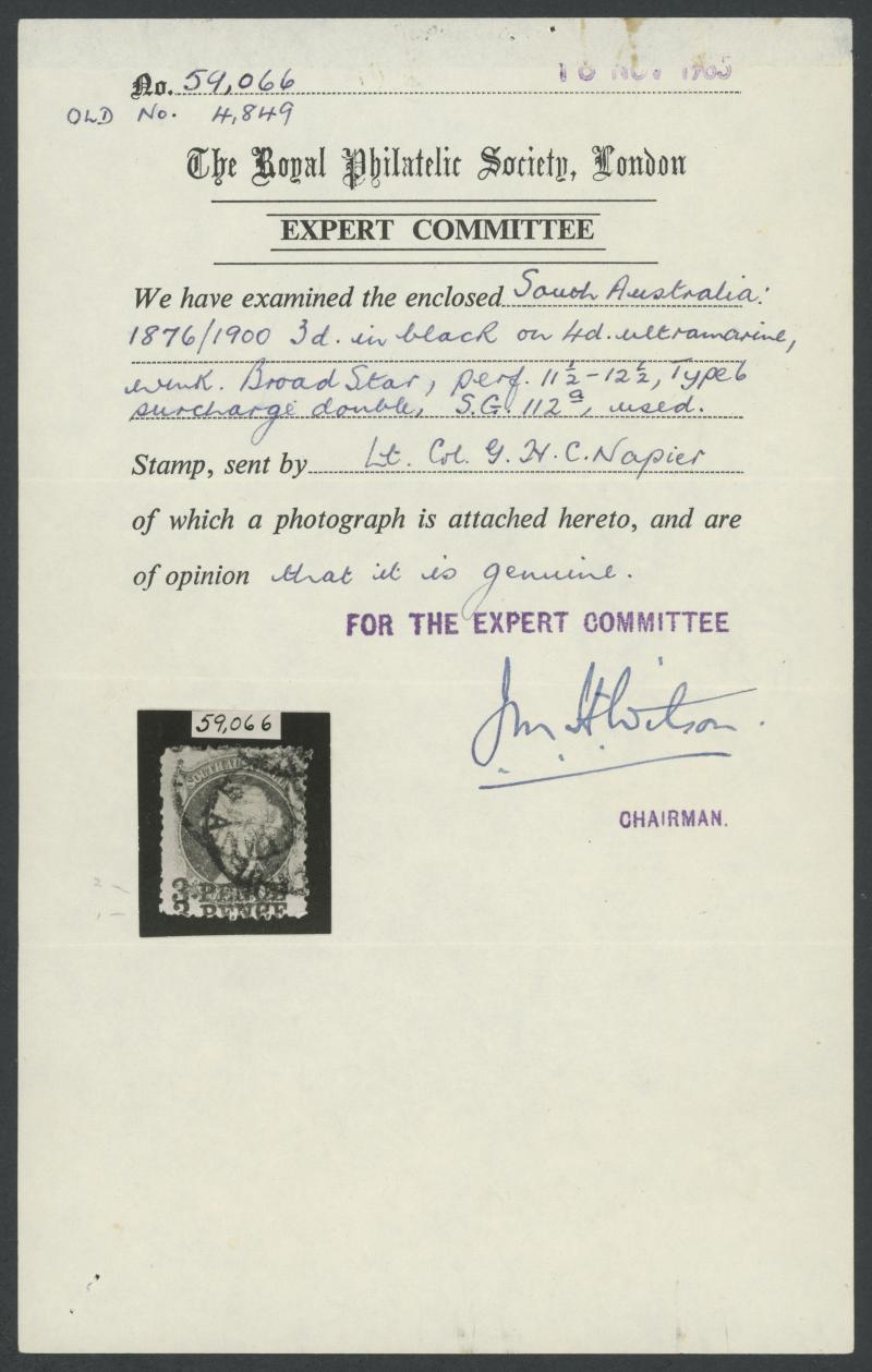 lower-right that has been folded over at one point and thus has a small crease, multiple light but slightly untidy Adelaide cancels, Cat £2500. RPSL Certificate (1965) issued to Lt Col GHC (Harry) Napier. Don Pearce's very fine example with the