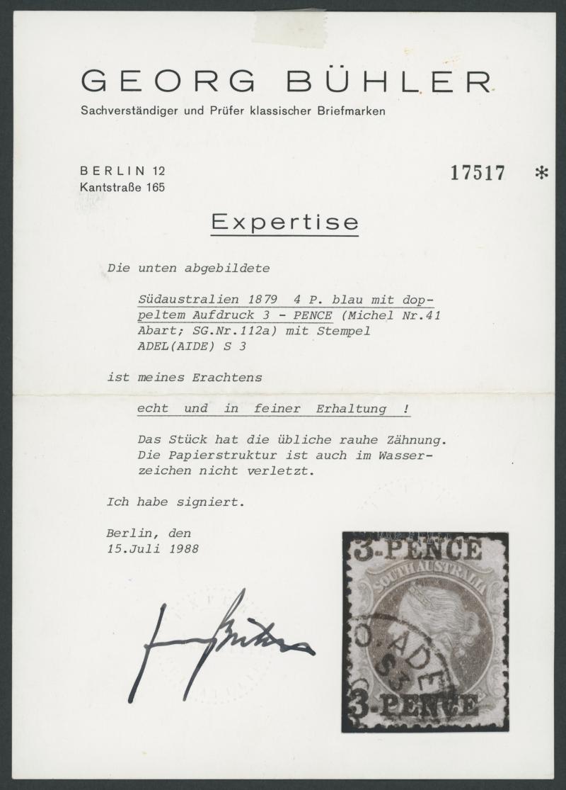 characteristically with the second overprint at the top, small closed tear at upper-right, framed GPO cds, Cat £2500. Georg Buhler (1988) and RPSV (1999) Certificates. Don Pearce's very fine example sold for $3595 (Sale 249 Lot 1201). (Image1) (Image2)