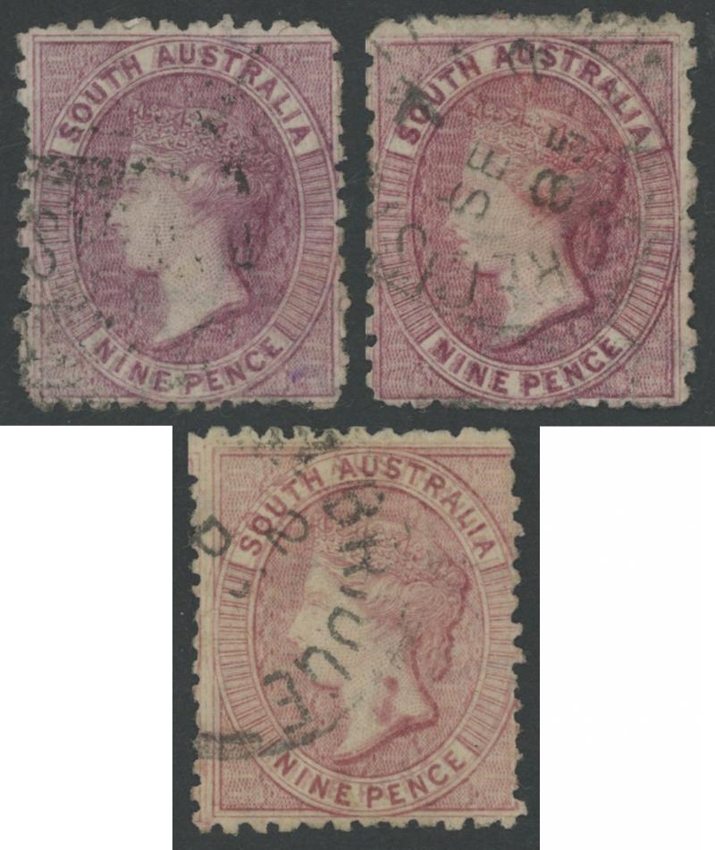 1876-1900 QV Perkins Bacon Broad Star Watermark Perf 11½-12½ 9d red-purple as SG 122 x2 and 9d rose-lilac as SG 123 all with clear