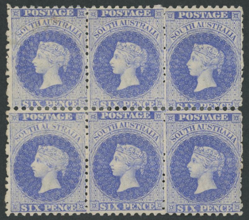 10x11½-12½ block of 6 (3x2), minor natural wrinkling, reinforced perfs, very fresh with large-part gum, Cat £960+ for singles. One of the most attractive of all the Perkins Bacon shades. Ex John Griffiths and Don Pearce: sold for $1555 (Sale 249 Lot