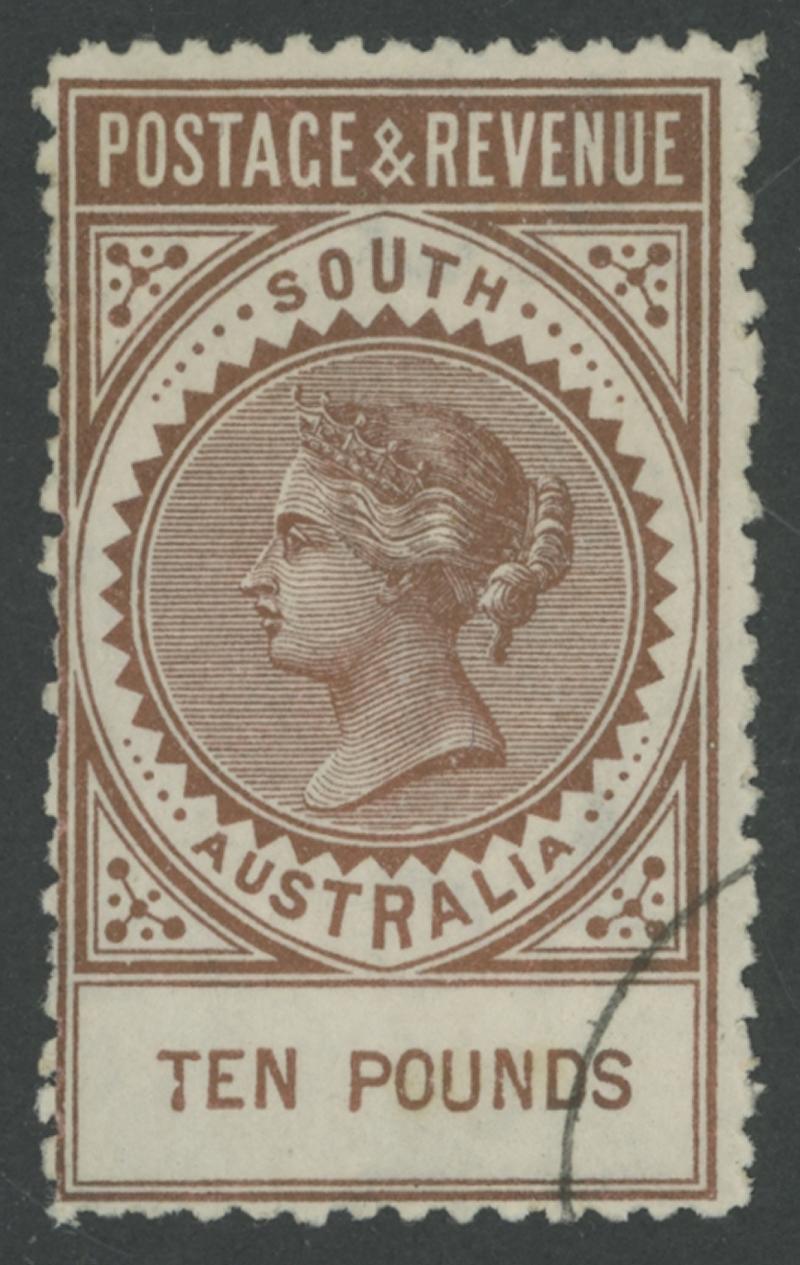 1886-96 QV De La Rue Tall Stamps 'POSTAGE & REVENUE' Perf 11½-12½ £10 bronze SG 206a with strong metallic sheen, CTO with Melbourne