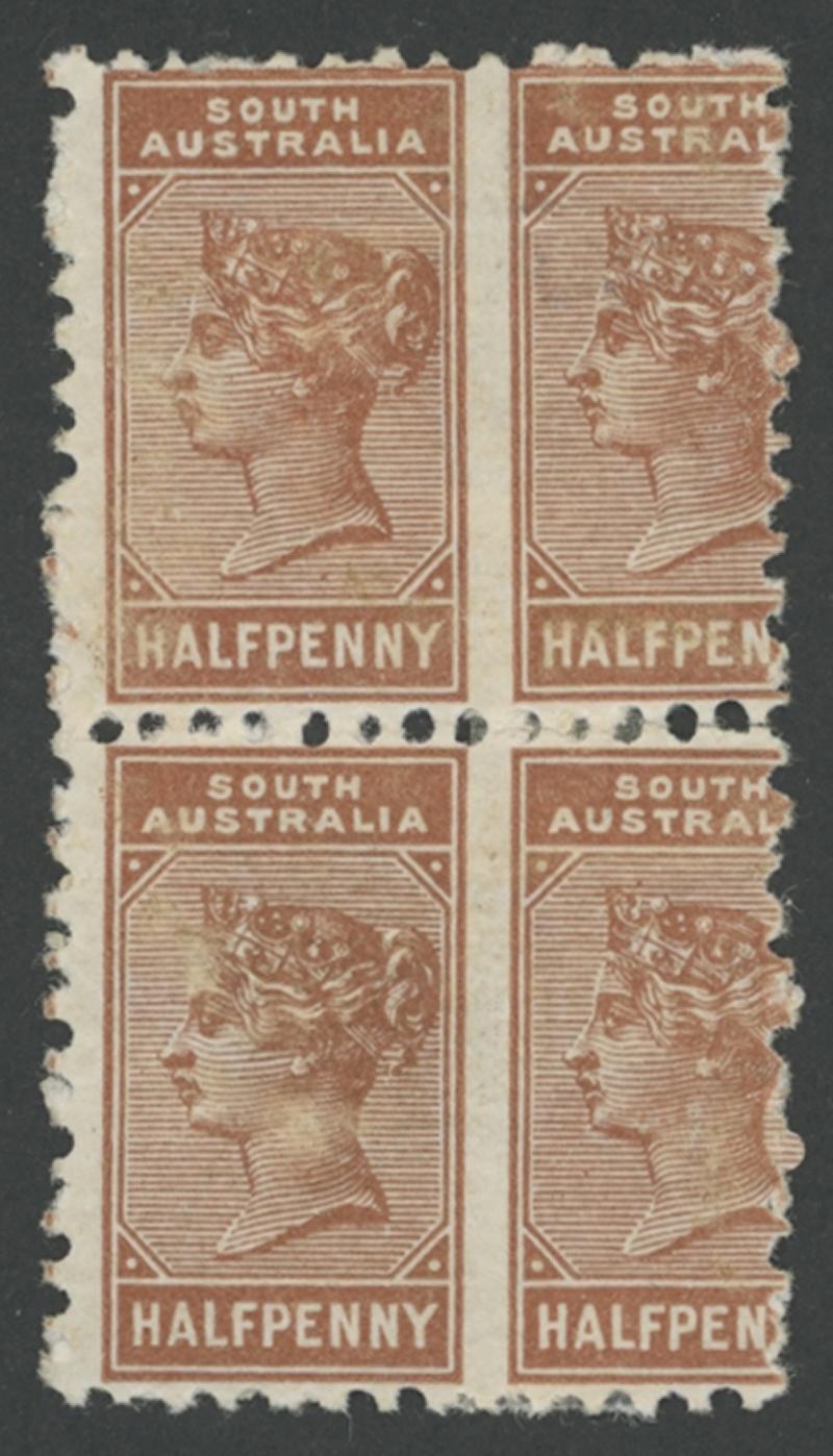 1883-99 QV De La Rue New Denominations Perf 13 'Bantam' ½d red-brown horizontal pair Imperforate Between SG 191a block of 4 with