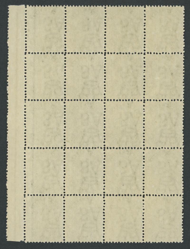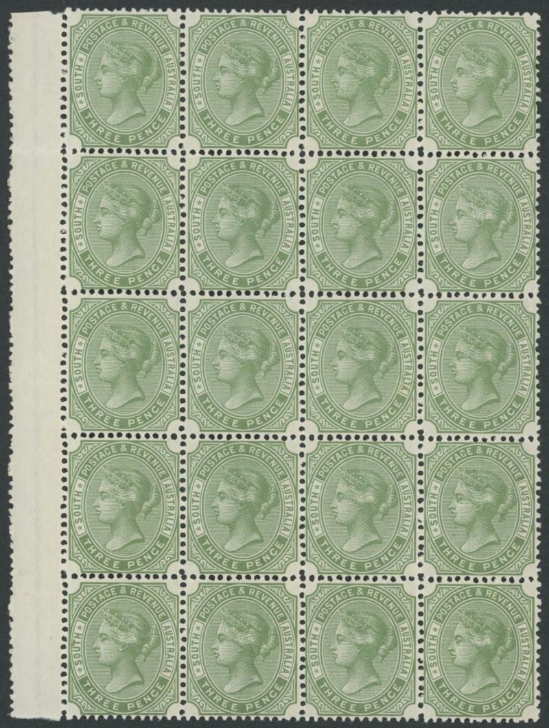 1883-99 QV New De La Rue Denominations Perf 13 3d deep olive-green SG 192a marginal block of 20 (4x5) from the left of the