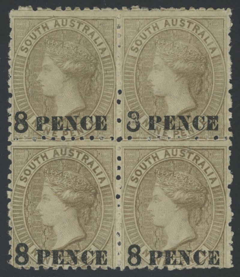 resulting in a 'dwarf' stamp with '8 PENCE' over 9d Missing, very fine framed GPO cds of 'SP18/78'. In effect, a 9d brown which, of course, was never issued. Ex Gary Diffen - stated to be 'the only example recorded' - sold for £144. (Image1) (Image2)
