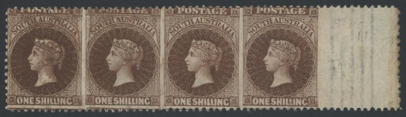 1876-1900 QV Perkins Bacon Broad Star Watermark Perf 11½-12½ 1/- chocolate (Large Holes) marginal horizontal strip of 4 from the