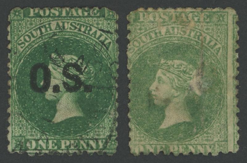 OVERPRINTED THICK 'OS': 1874-77 QV Perkins Bacon Large Star Wmk Perf 11½-12½x10 1d green SG O2 two misperforated examples, one