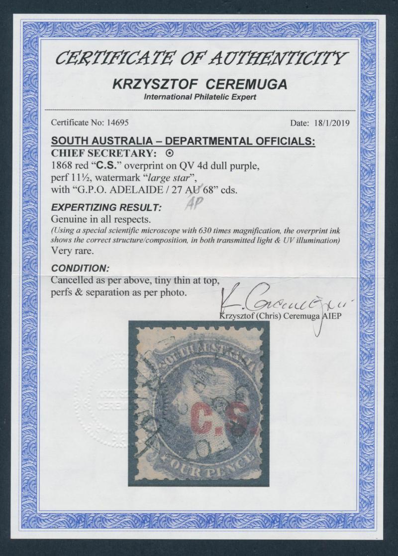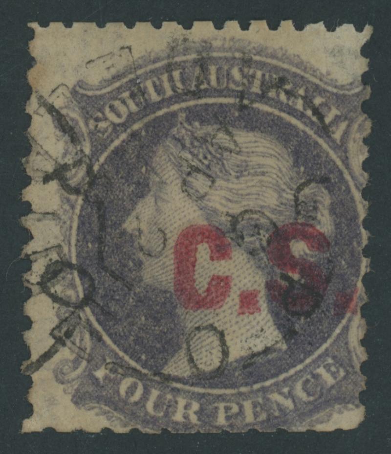 CHIEF SECRETARY: 'C.S.' in Red on QV Perkins Bacon Large Star Wmk Perf 11½-12½ 4d slate-purple SG DO141, slightly trimmed perfs at