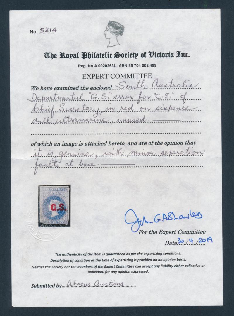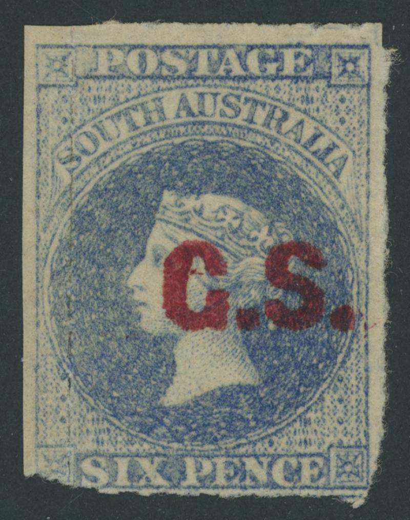 CHIEF SECRETARY: 'G.S.' (Error of Lettering for 'C.S.') in Red on QV Perkins Bacon Large Star Wmk Rouletted 6d dull ultramarine SG