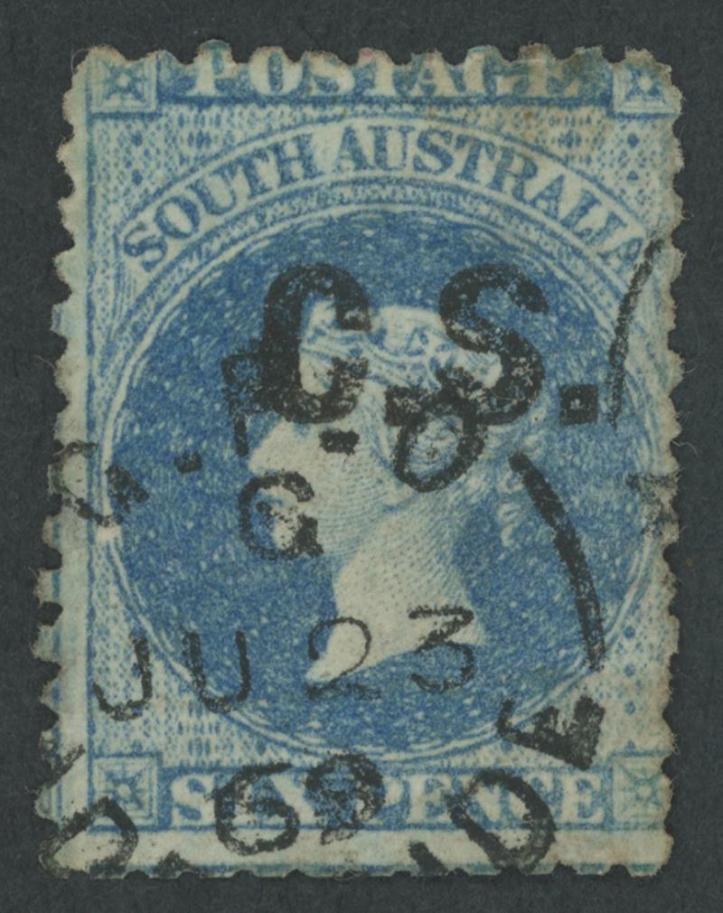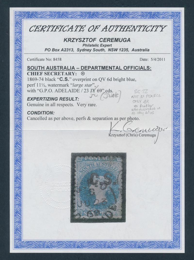 CHIEF SECRETARY: 'C.S.' in Black with on QV Perkins Bacon Large Star Wmk Perf 11½-12½ 6d bright blue SG DO151, minor blemishes,