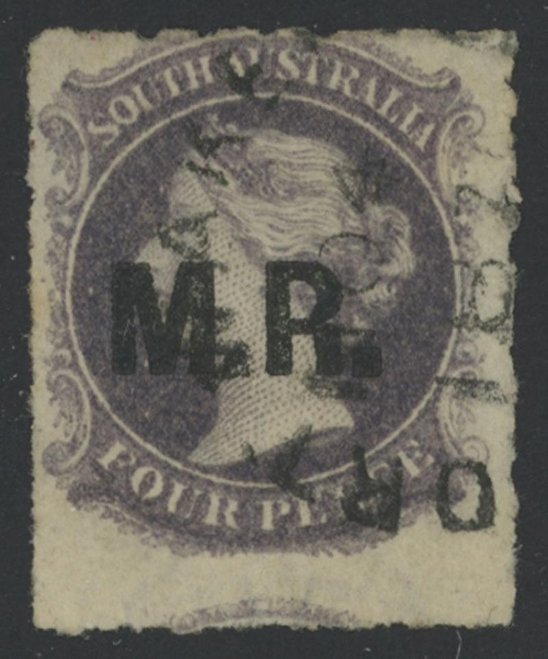 Black 'M.R.' on QV Perkins Bacon Large Star Wmk Rouletted 4d deep purple, rouletting on all sides, unusually with large unframed 'PORT WAKEFIELD' cds, Cat £350. Rated R+: unrecorded unused by Ron Butler. Ex Peter Kowald: sold for $307 (Sale 246 Lot
