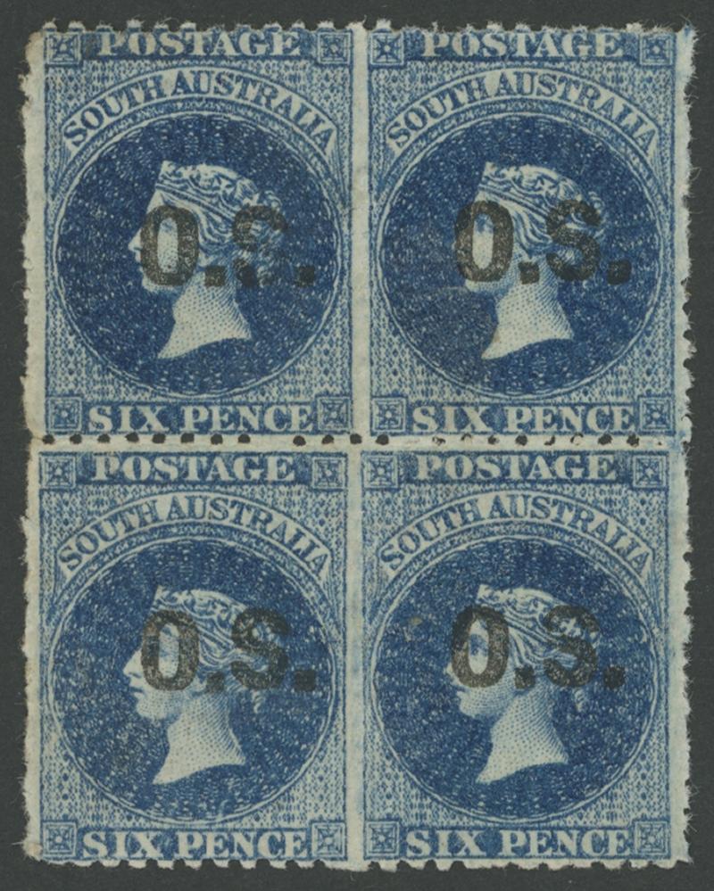 OVERPRINTED THICK 'O.S.': 1874-77 QV Perkins Bacon Perf 11½-12½ 6d Prussian blue SG O10 block of 4, unused, Cat £1100+ for