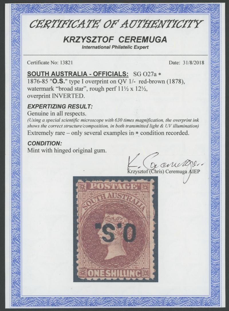 OVERPRINTED THICK 'O.S.': 1876-85 QV Perkins Bacon Broad Star Wmk Perf 11½-12½ 1/- red-brown with the Overprint Inverted SG O27a,
