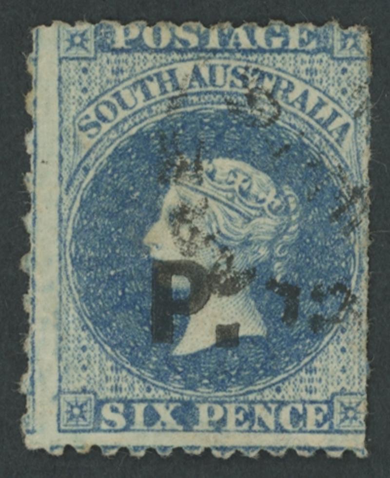 POLICE: 'P.' in black on QV Perkins Bacon Perf10½-11½xRouletted 6d blue SG DO392, characteristic poor centring with the design