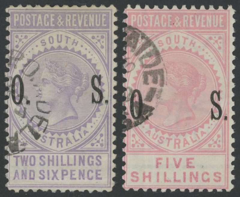 SG O86-87, the 2/6d with a light horizontal bend at the base which is a characteristic of these stamps and the 5/- with two faint horizontal creases at left none of which affect the very fine facial appearance, CTO with unframed 'GPO ADELAIDE' cds,
