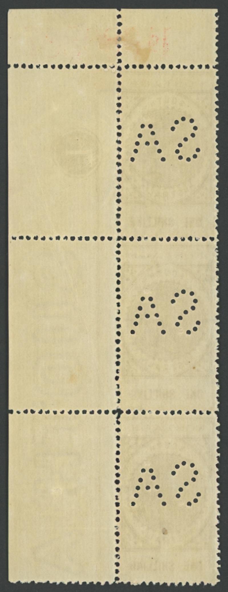 PUNCTURED 'SA': 1902-04 QV De La Rue Tall Stamps Thin 'POSTAGE' 1/- brown marginal vertical strip from the upper-right corner of