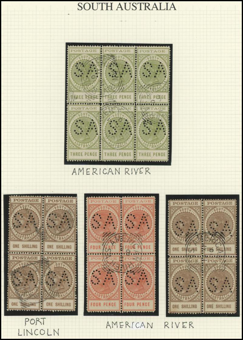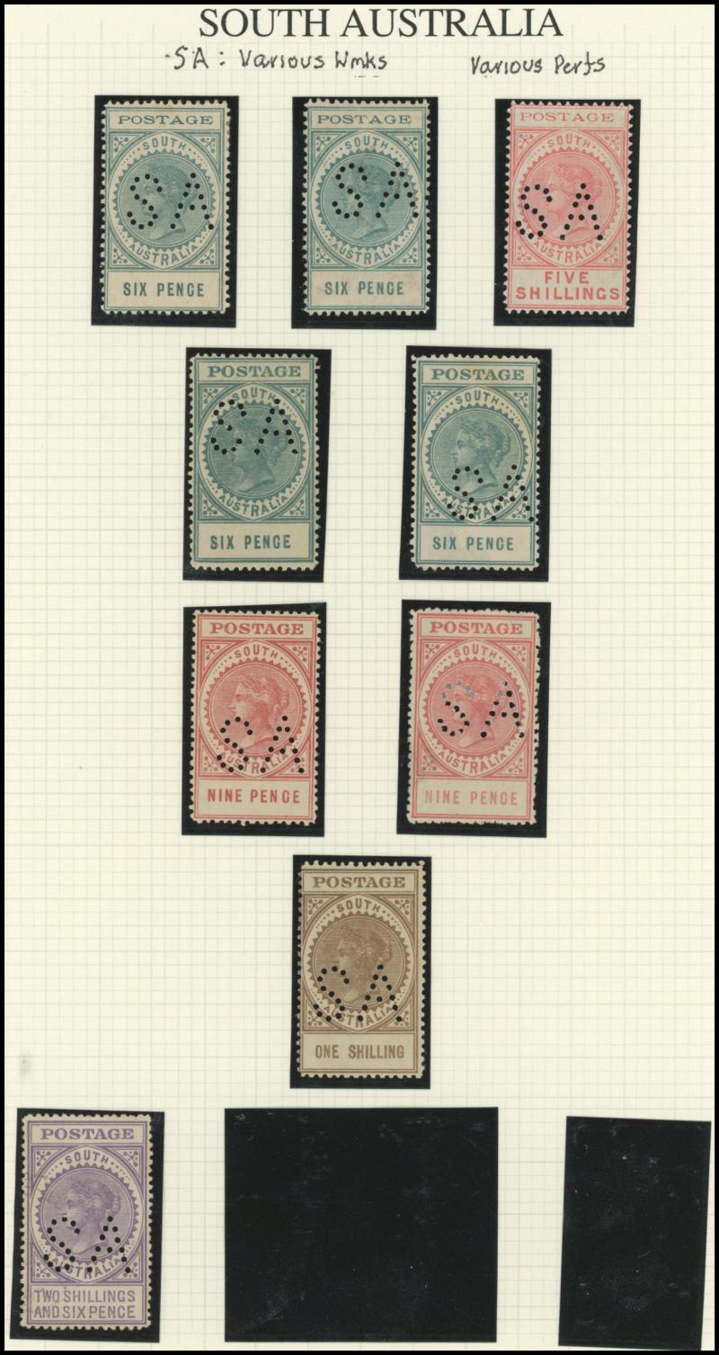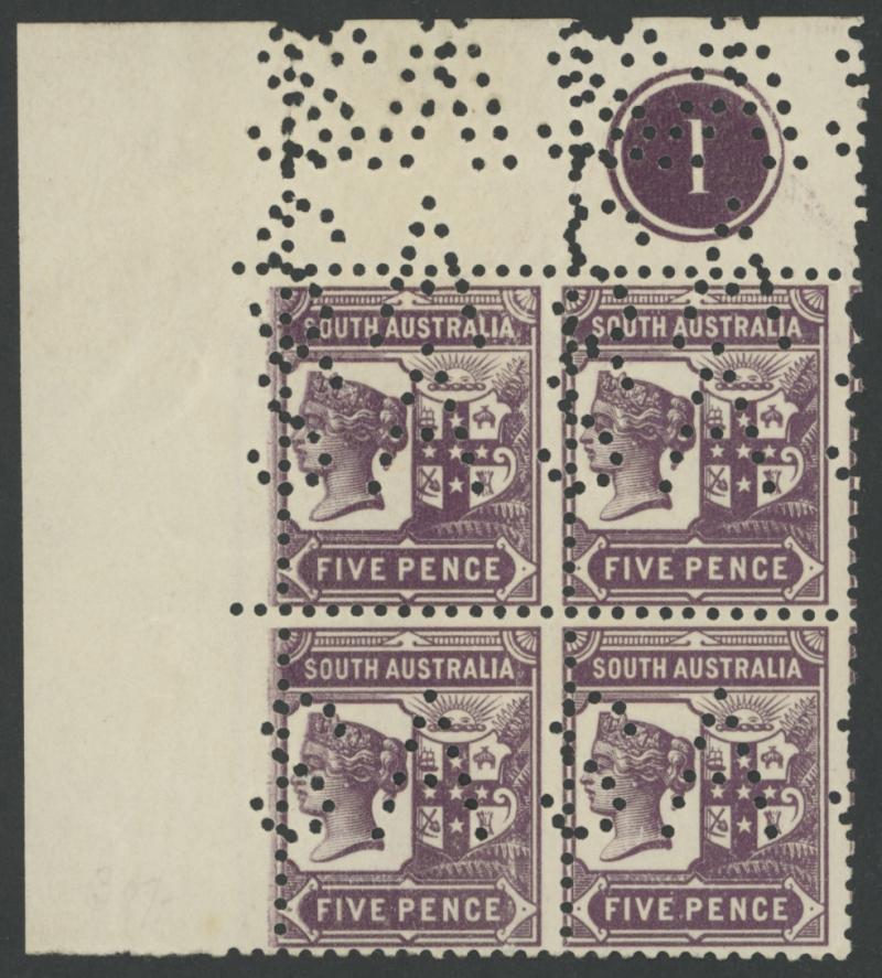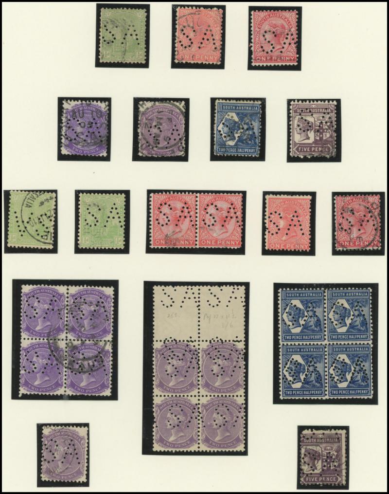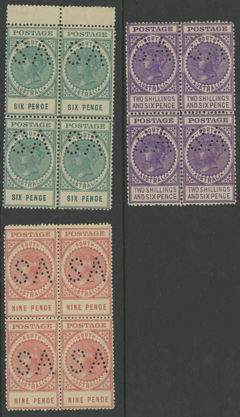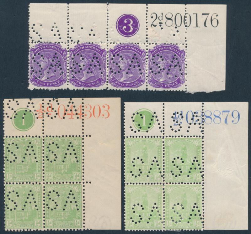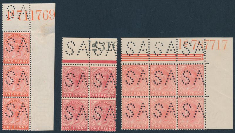 Upper Units, 2½d block of 4 with Double 'SA' on the Lower Units and 5d Plate Number '1' block of 4 with Double 'SA' on the Upper Units and in the Upper Margin, etc, also punctured 'OS' ½d x3 (one mint), 1d x5 (one mint) & 2½d mint.