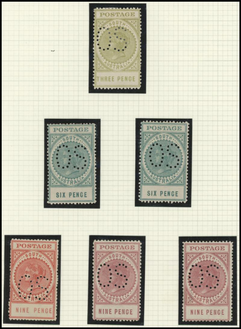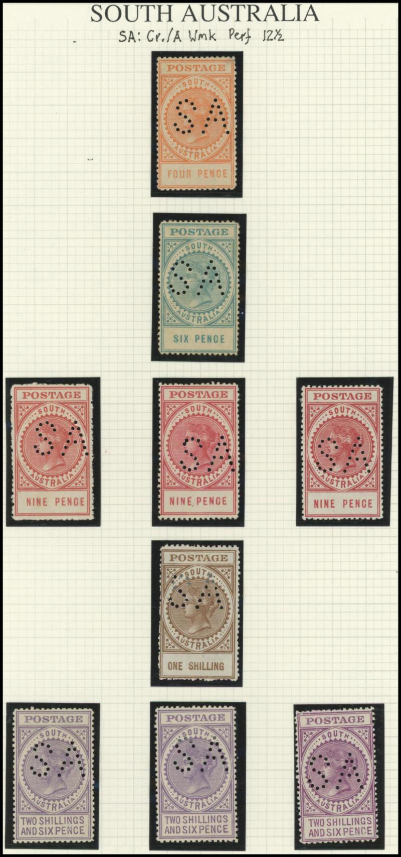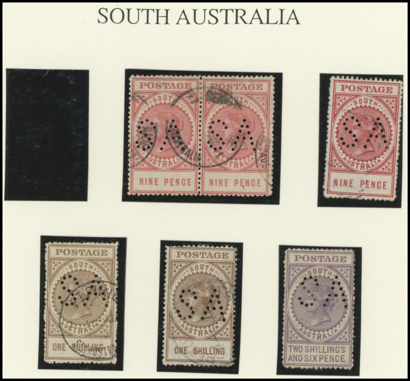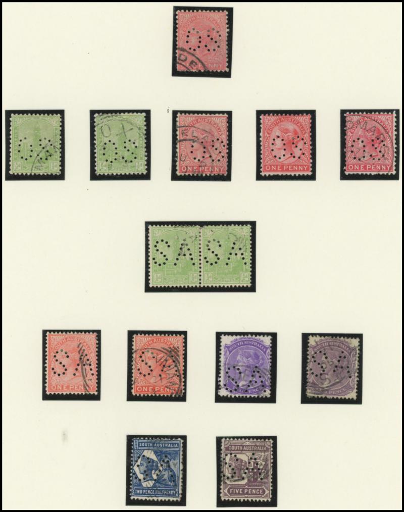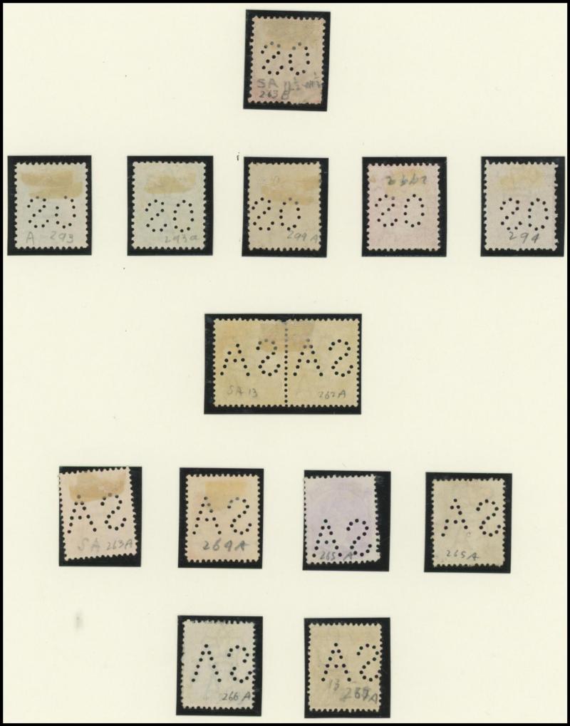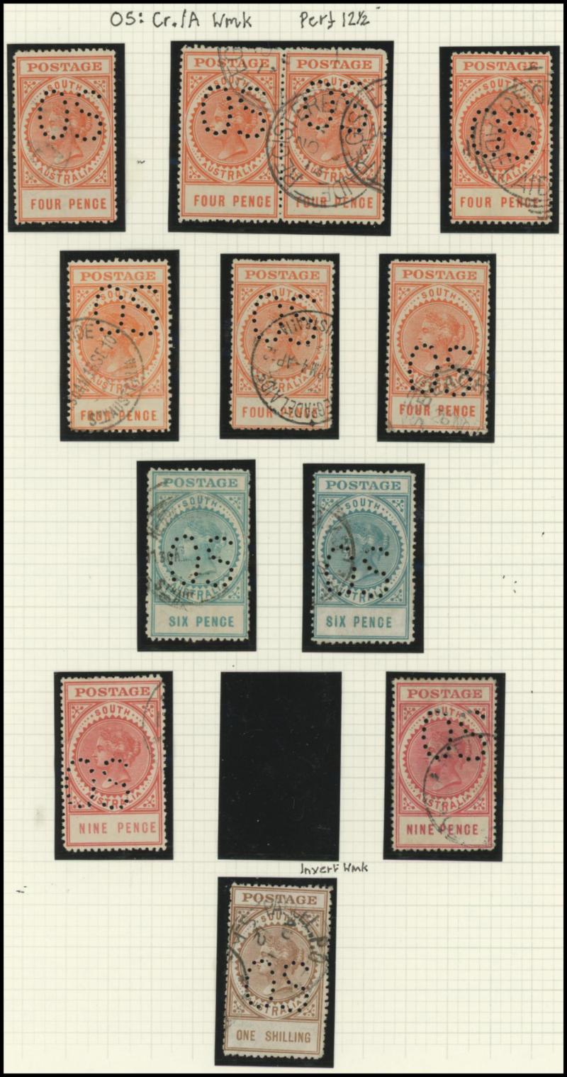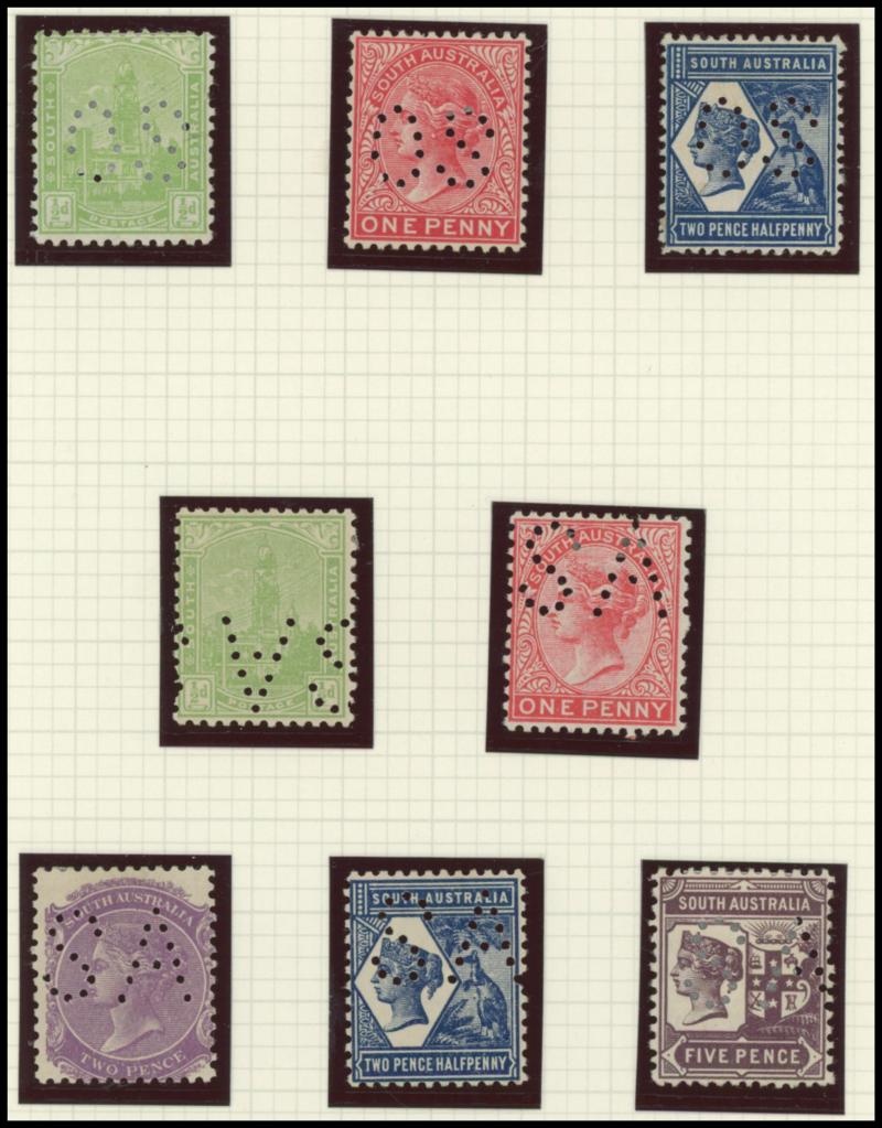 Upper Units, 2½d block of 4 with Double 'SA' on the Lower Units and 5d Plate Number '1' block of 4 with Double 'SA' on the Upper Units and in the Upper Margin, etc, also punctured 'OS' ½d x3 (one mint), 1d x5 (one mint) & 2½d mint.
