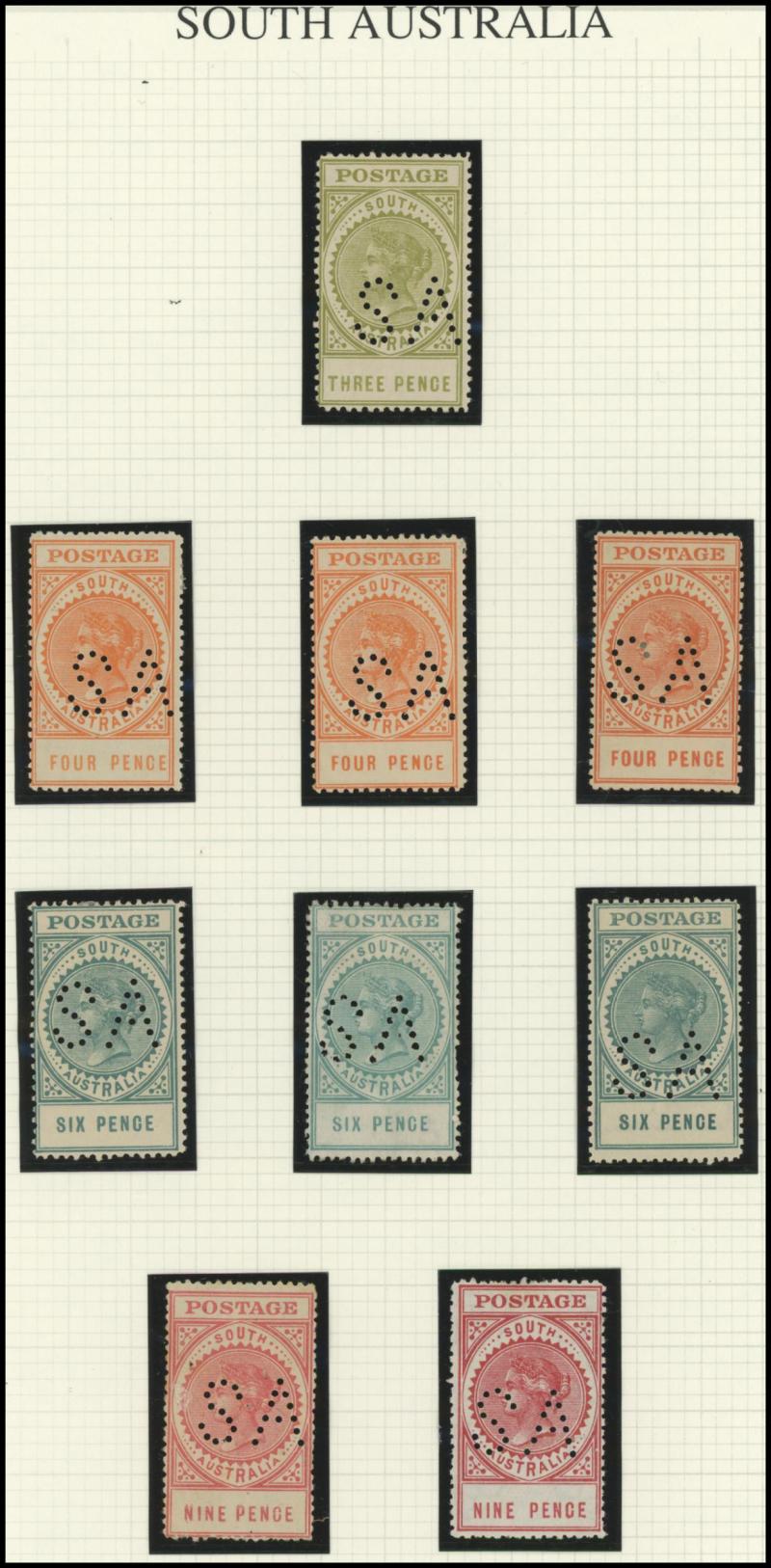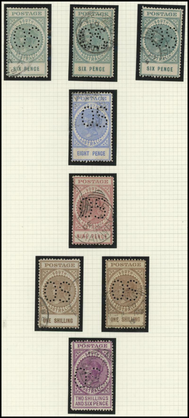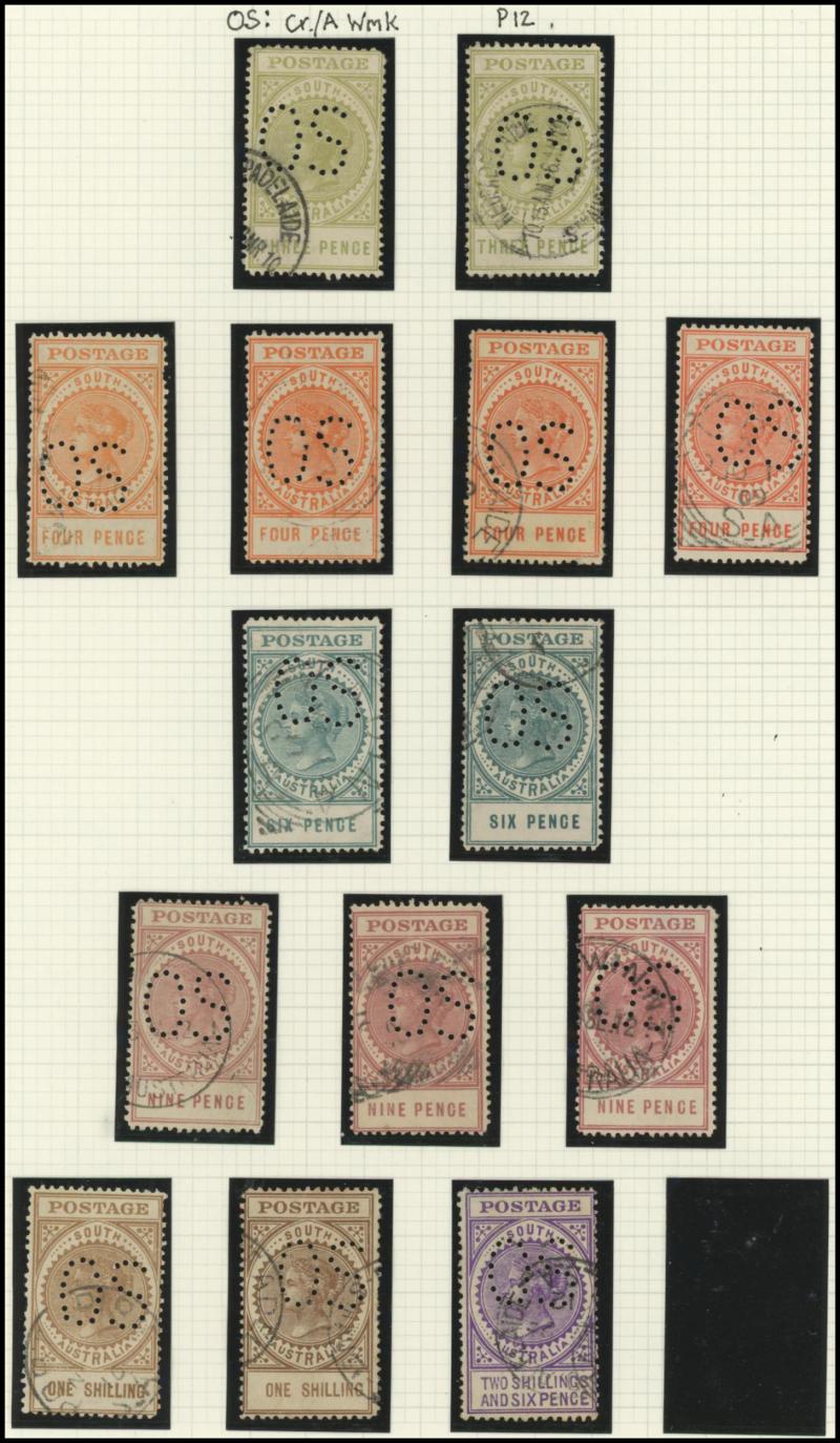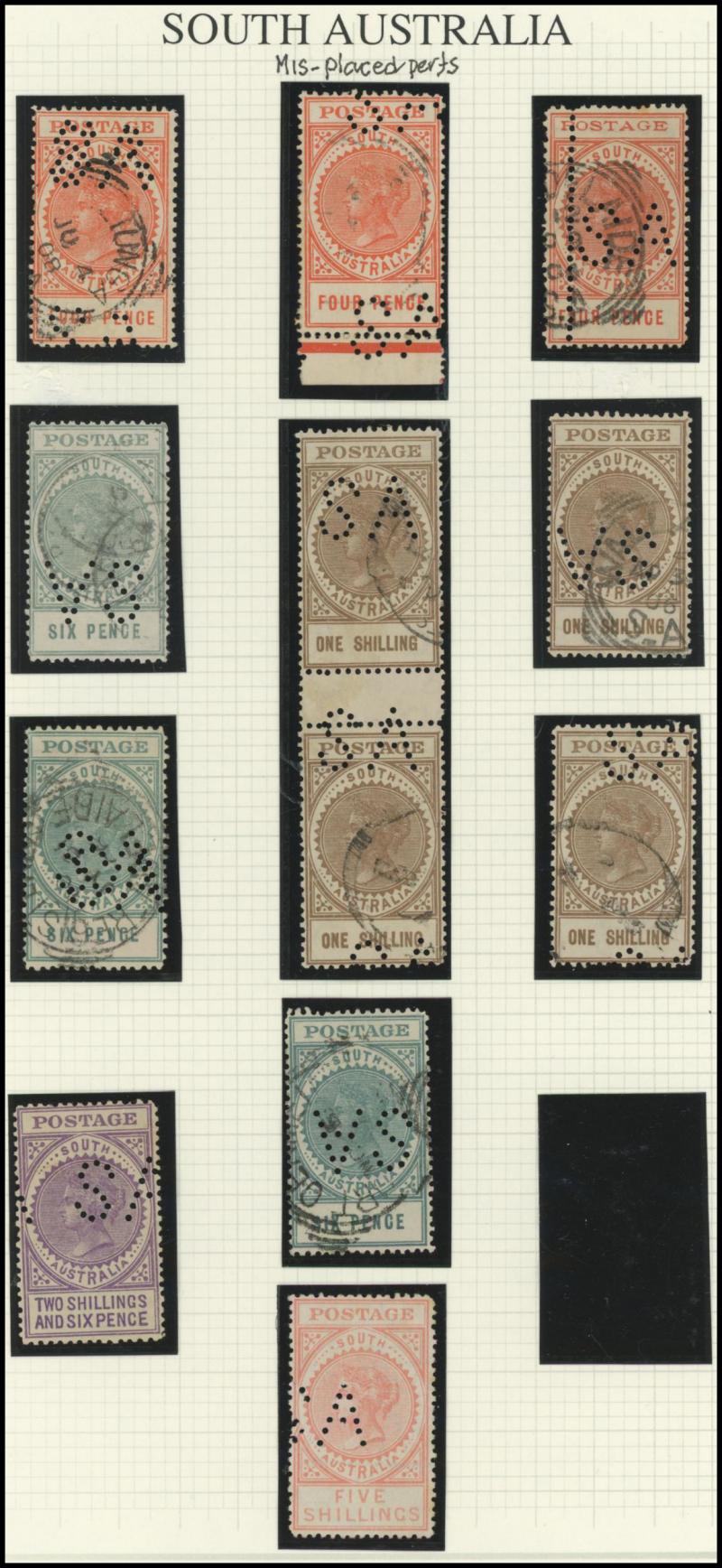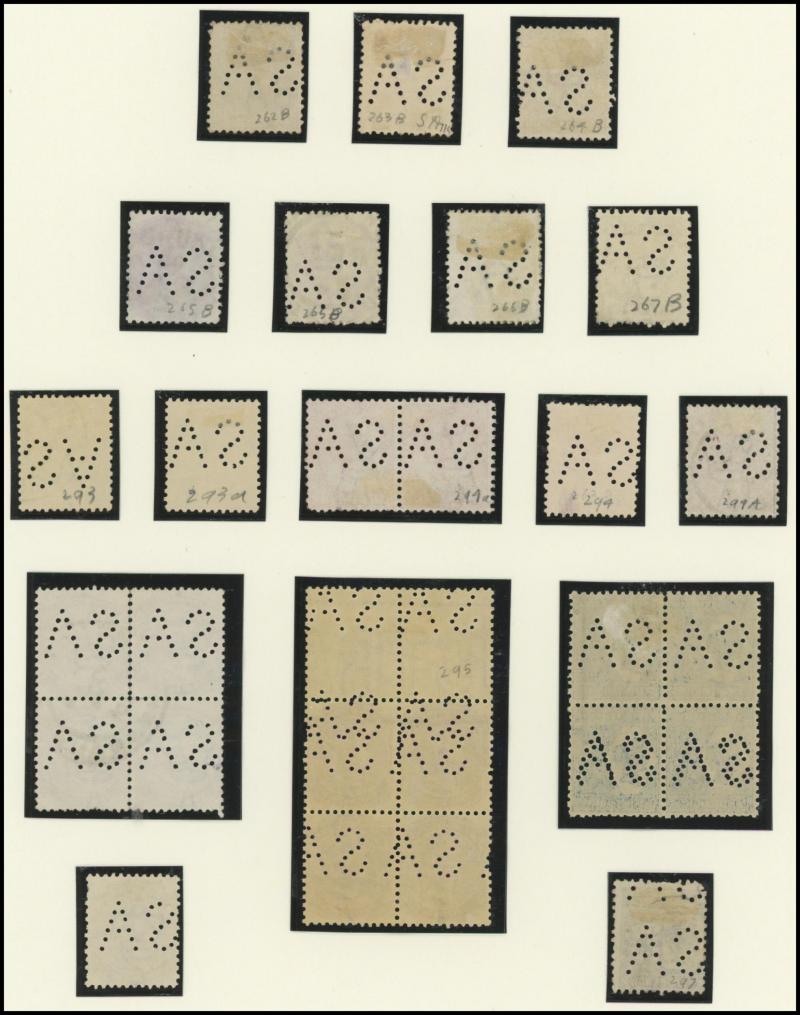 Upper Units, 2½d block of 4 with Double 'SA' on the Lower Units and 5d Plate Number '1' block of 4 with Double 'SA' on the Upper Units and in the Upper Margin, etc, also punctured 'OS' ½d x3 (one mint), 1d x5 (one mint) & 2½d mint.