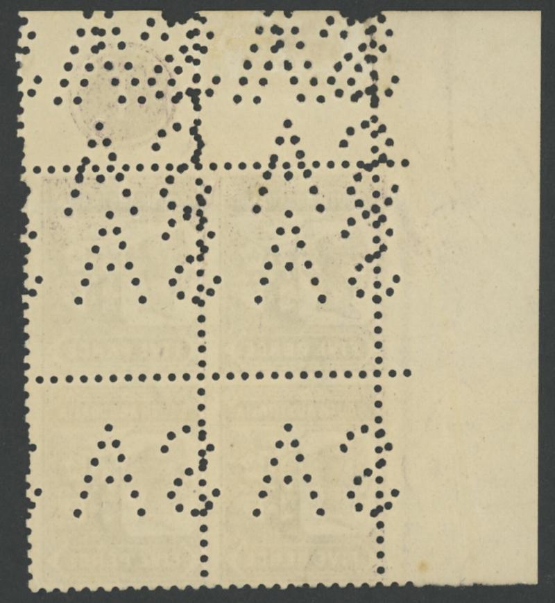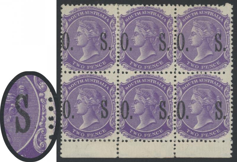 OVERPRINTED THIN 'O.S.' WIDE SETTING: 1899-1901 2d violet No Stop after 'S ' SG O82c being the lower-left unit in a marginal block