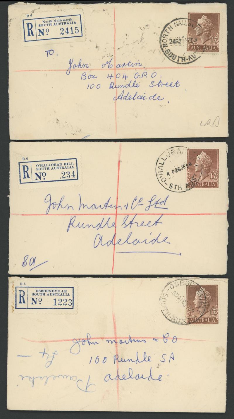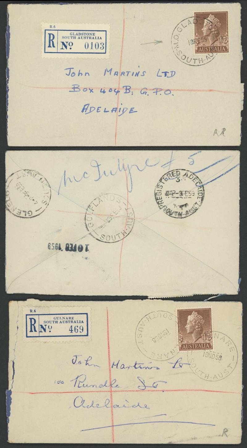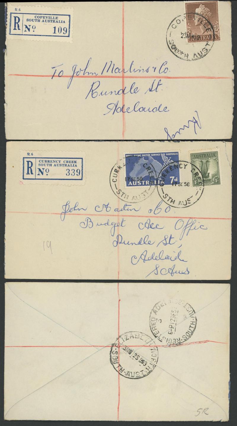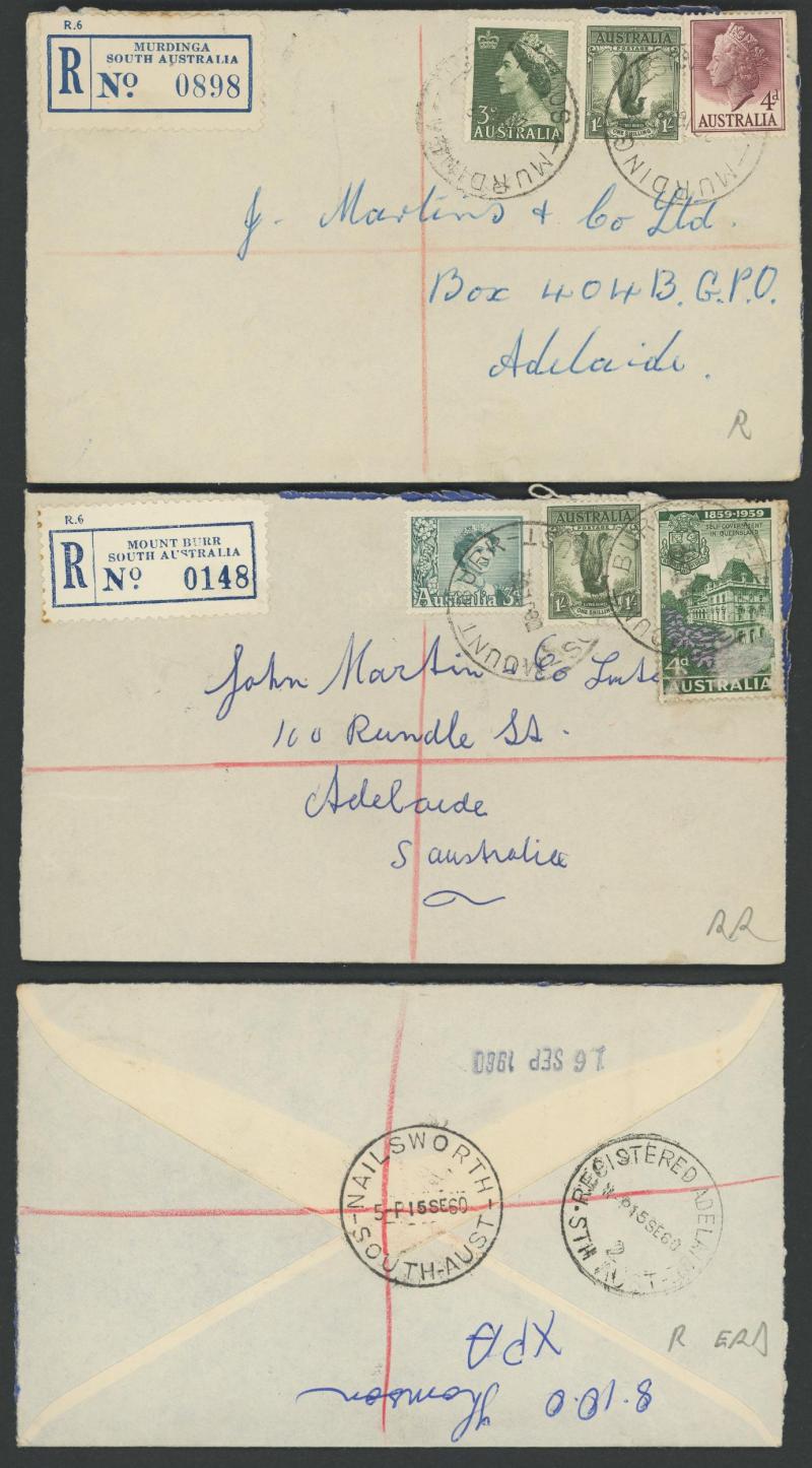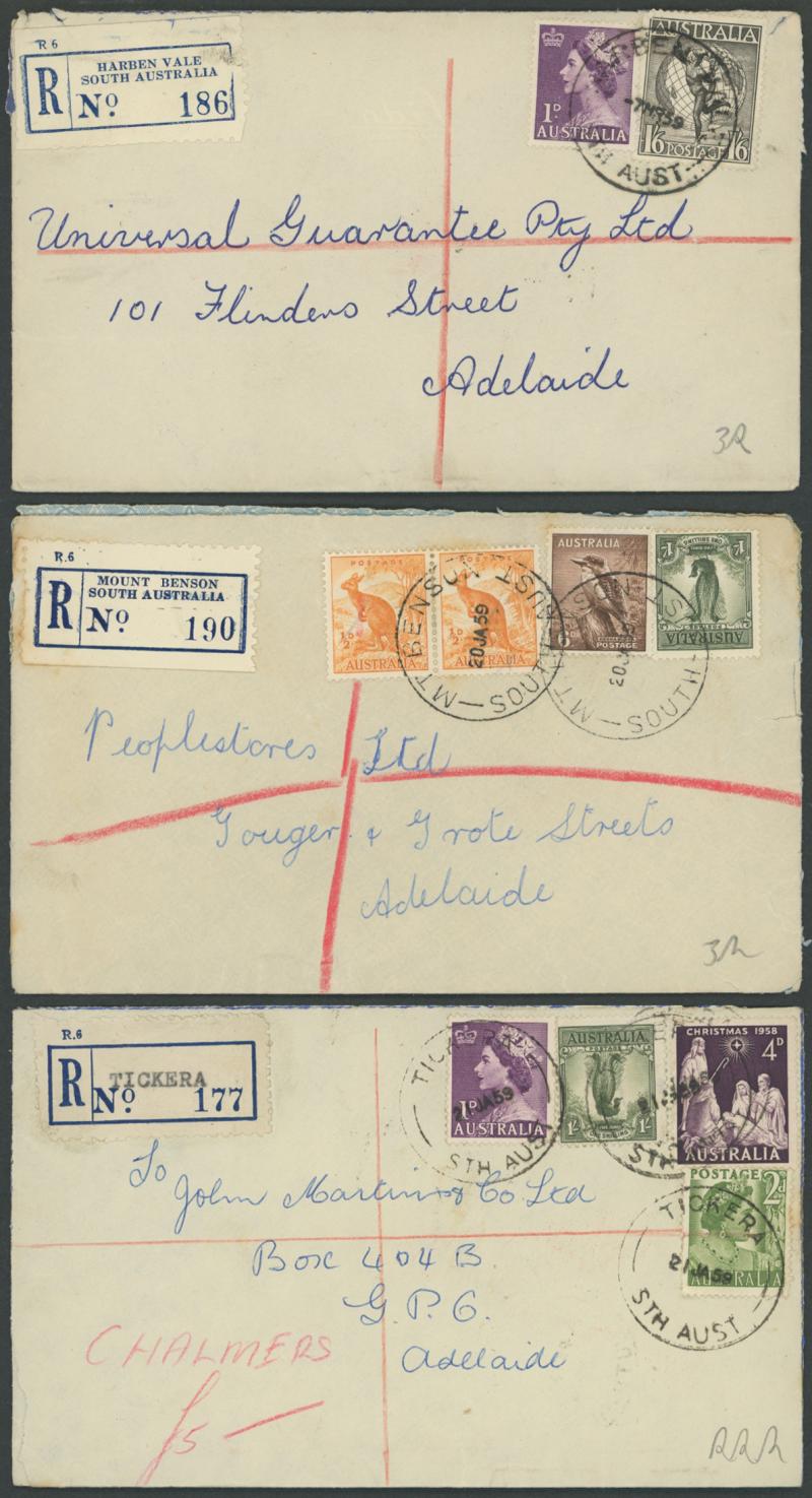 which had their names changed in this period - with lots of scarce usages including 'ELIZABETH NORTH/12SE59/...' with small Decade Wheel (unlisted), 'HARBEN VALE' (RRR), 1959 'MT BENSON' (RRR), 'PENOLA/24SE60/...' with 12mm arcs (ERD by 9 years),