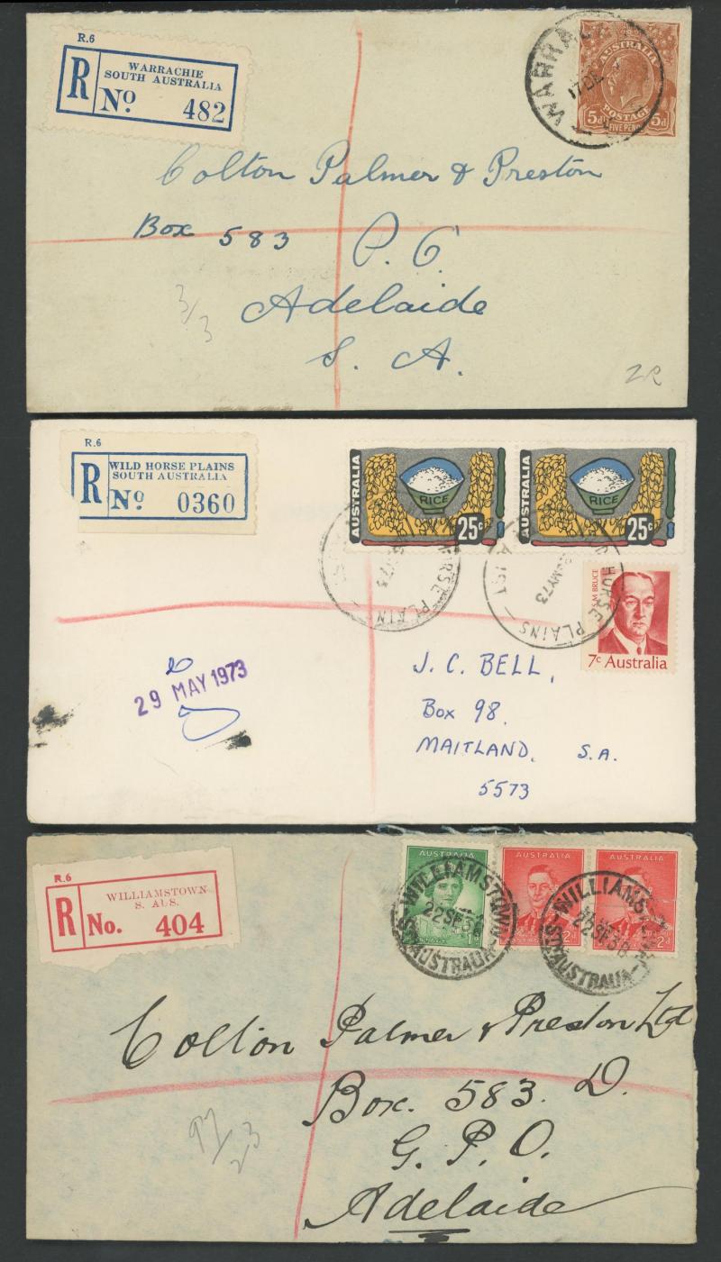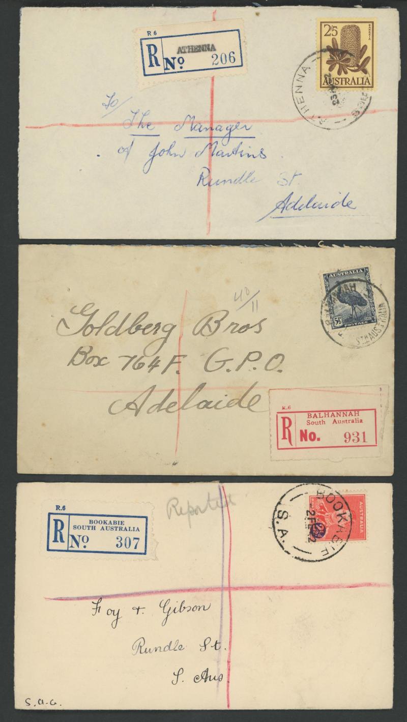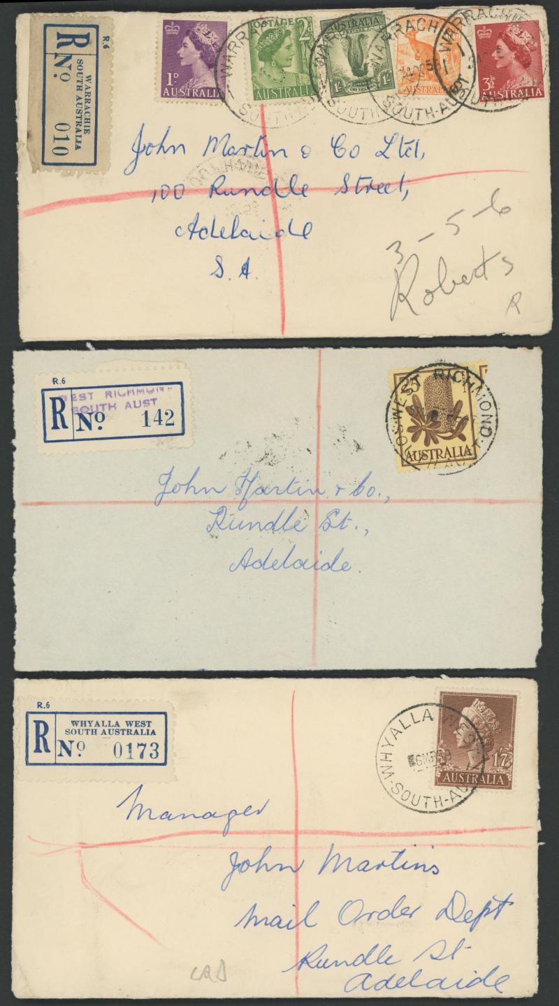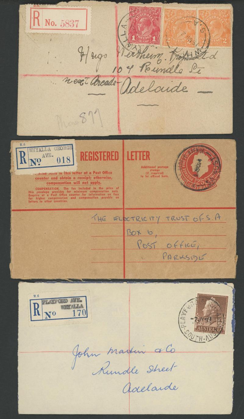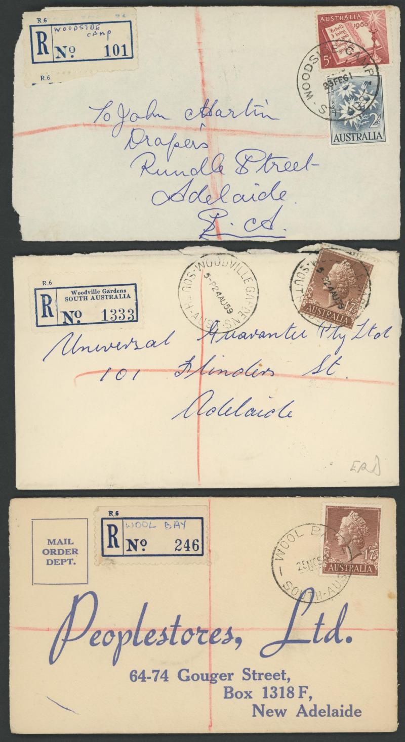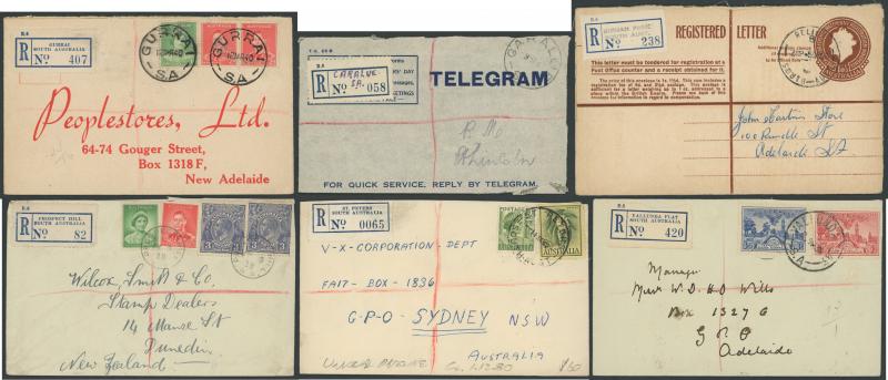 (SDL; the only recorded date), 'WHYALLA GEORGE AVENUE', 1937 'WAARACHIE', 1965 'WARRADALE/ 2 ', 1940 'WOKURNA', etc, many early provisional & makeshift R labels, mostly to large mail order companies with a high percentage opened-out. An exceptional