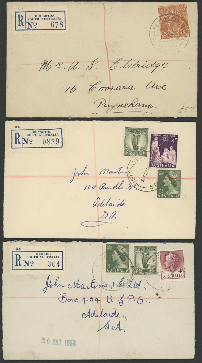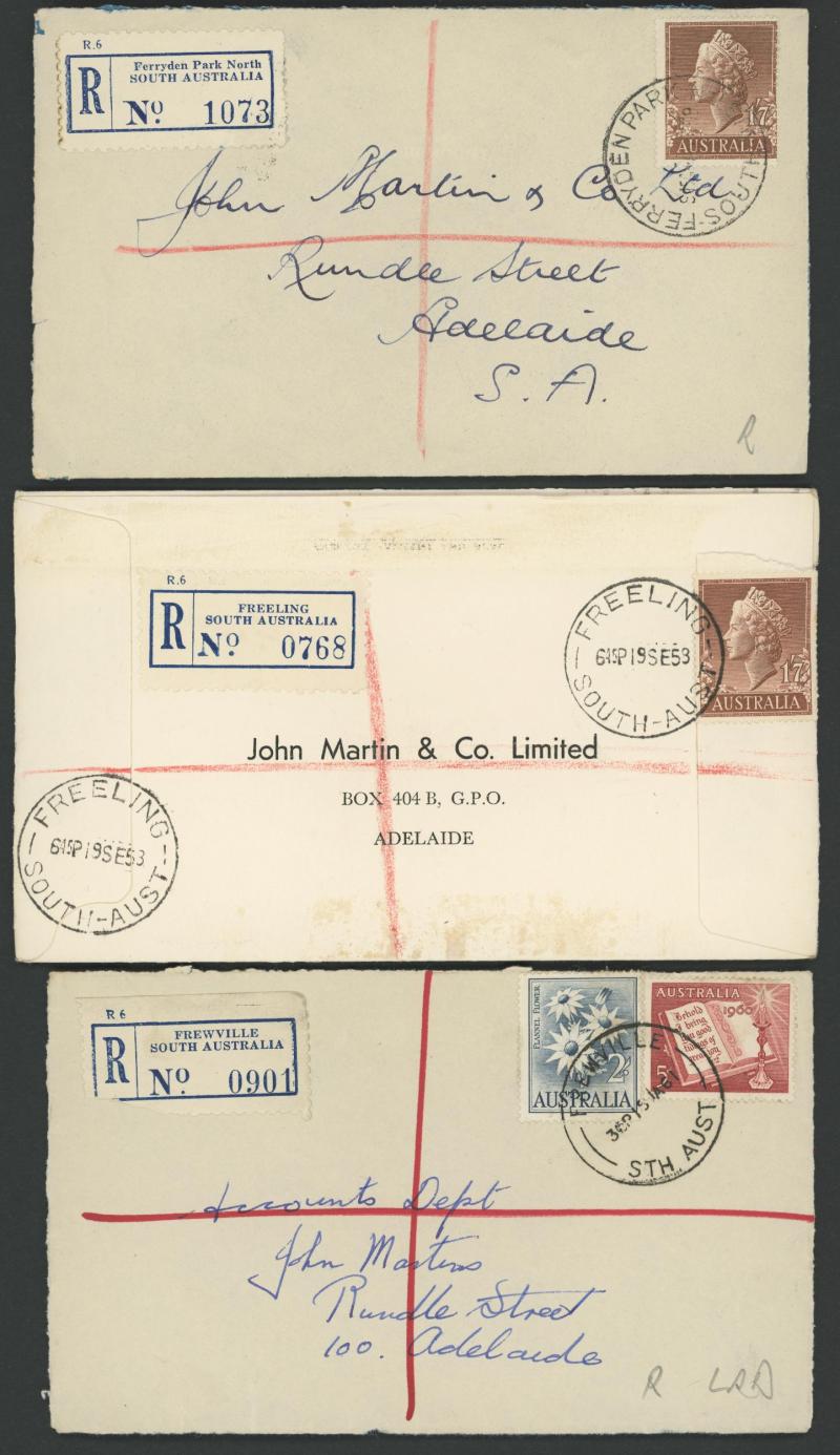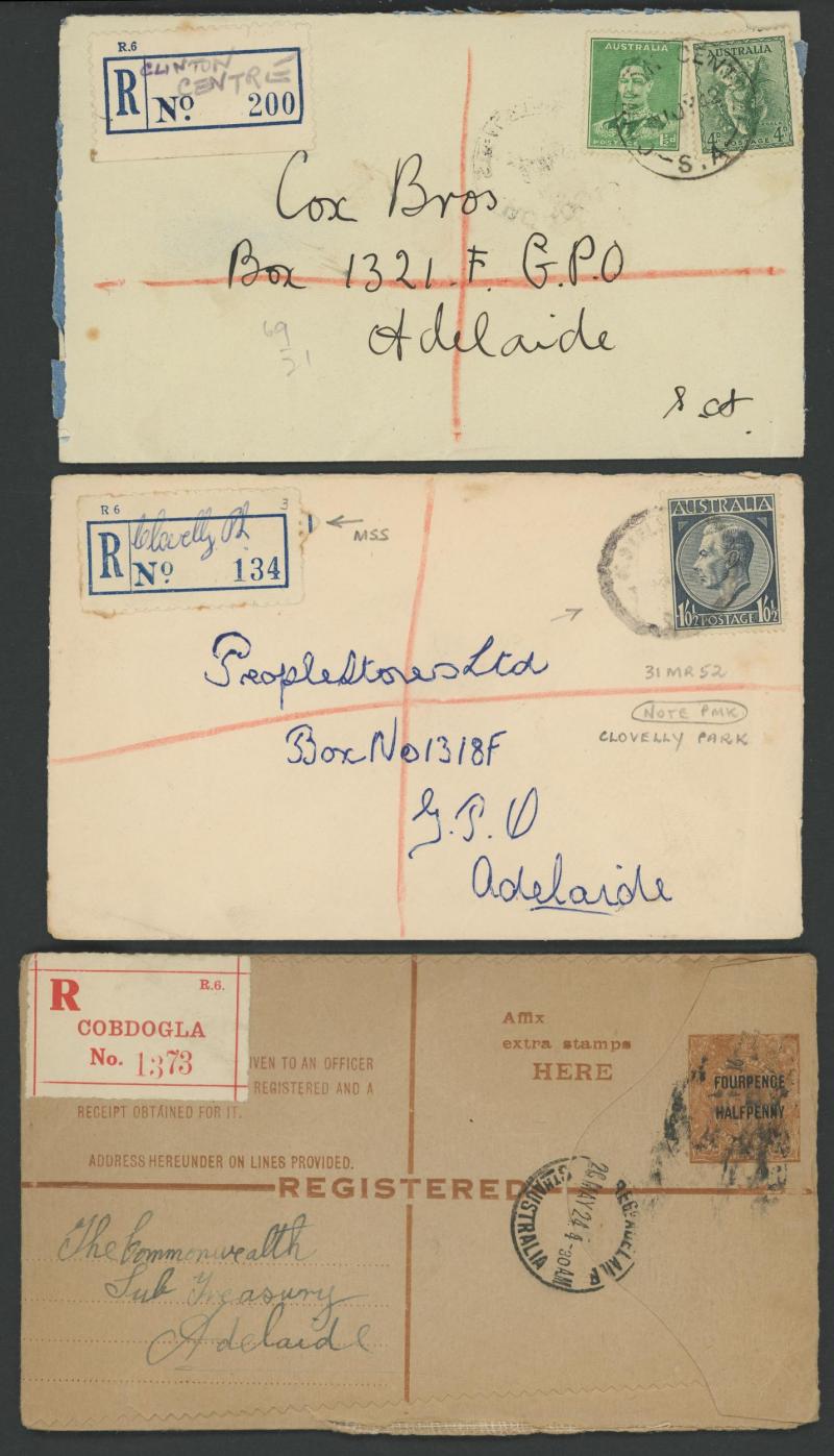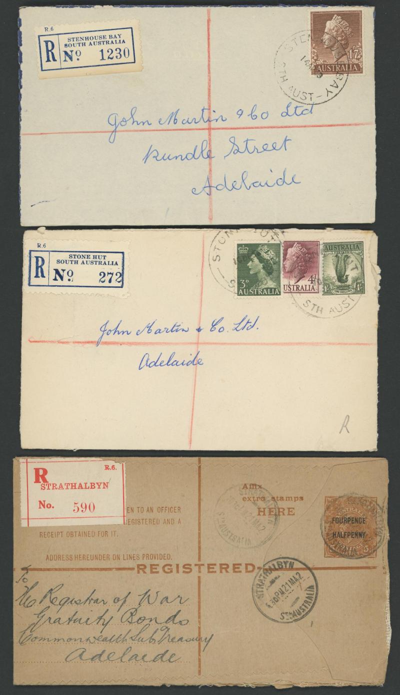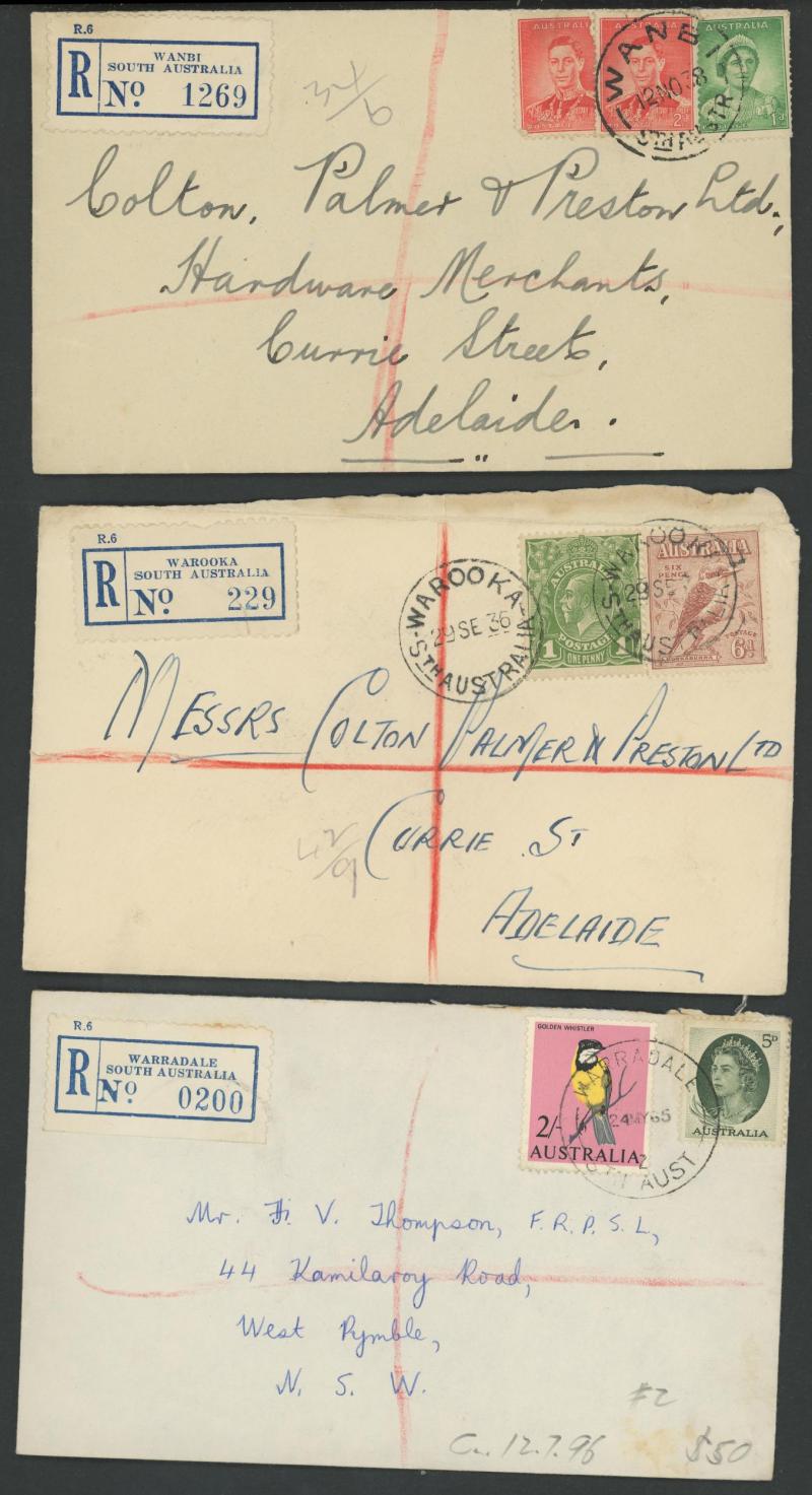 (SDL; the only recorded date), 'WHYALLA GEORGE AVENUE', 1937 'WAARACHIE', 1965 'WARRADALE/ 2 ', 1940 'WOKURNA', etc, many early provisional & makeshift R labels, mostly to large mail order companies with a high percentage opened-out. An exceptional