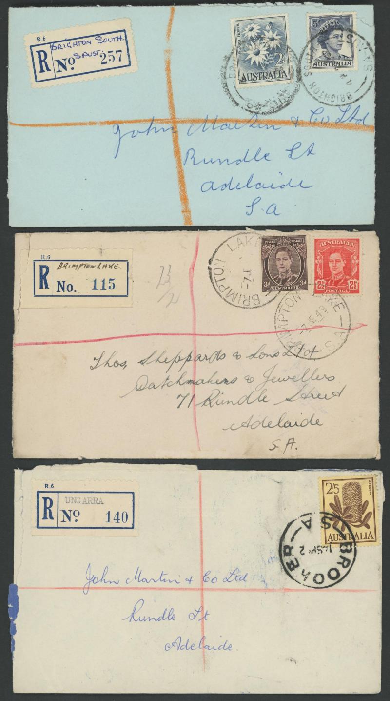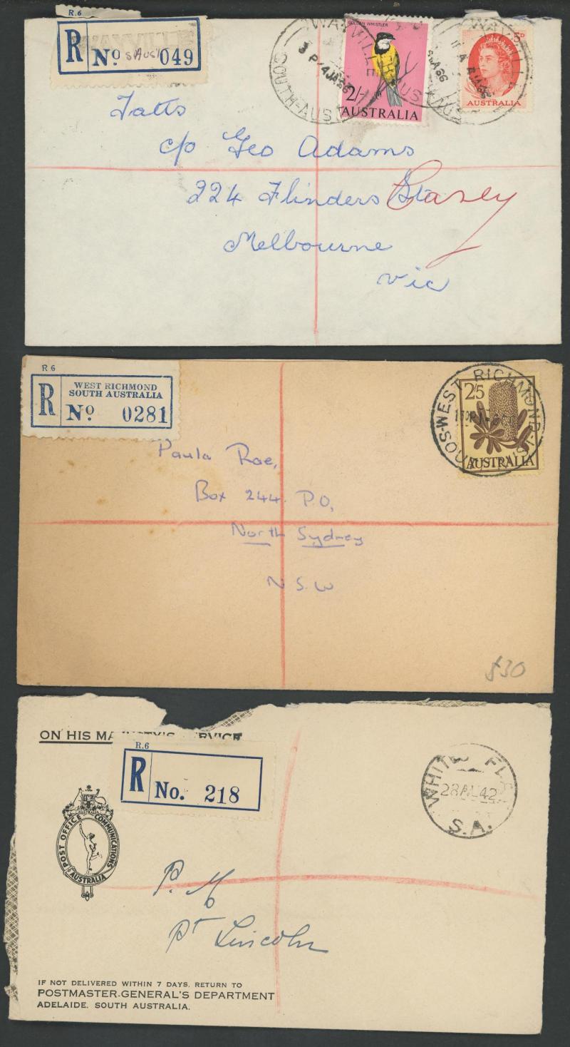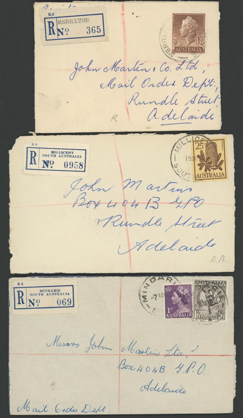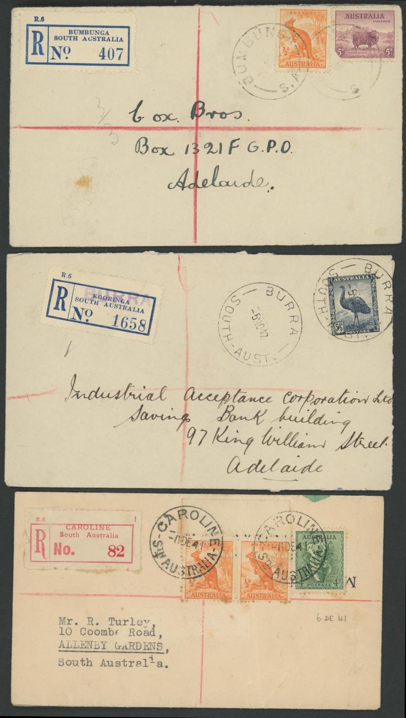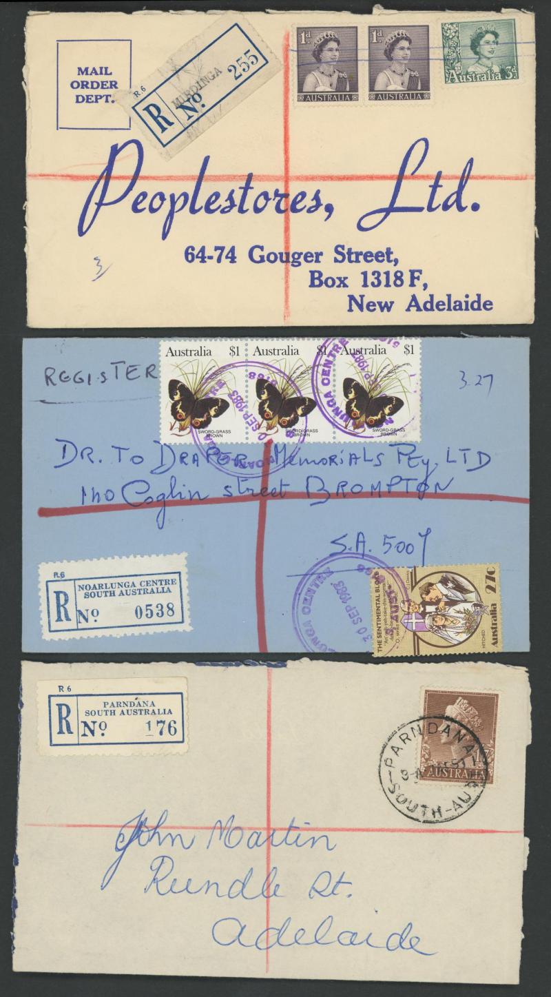 (SDL; the only recorded date), 'WHYALLA GEORGE AVENUE', 1937 'WAARACHIE', 1965 'WARRADALE/ 2 ', 1940 'WOKURNA', etc, many early provisional & makeshift R labels, mostly to large mail order companies with a high percentage opened-out. An exceptional