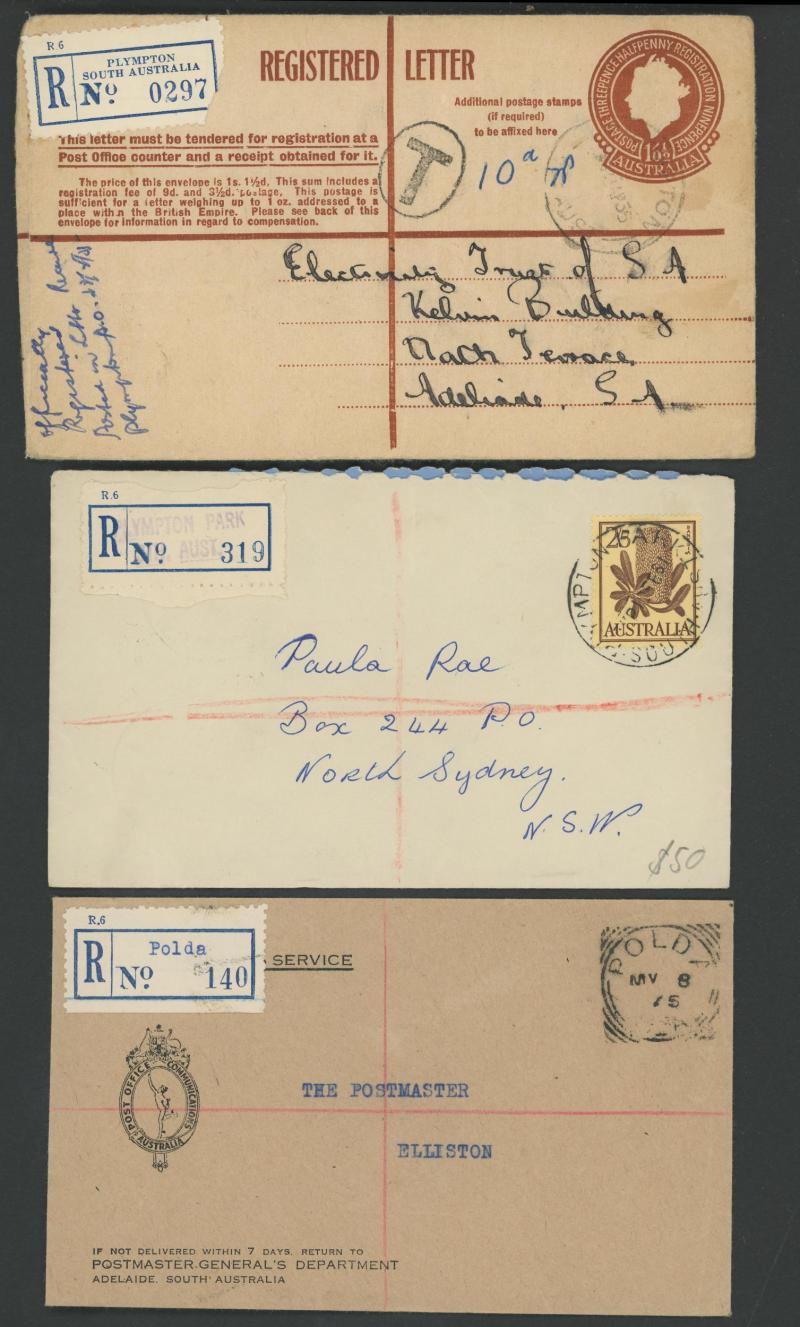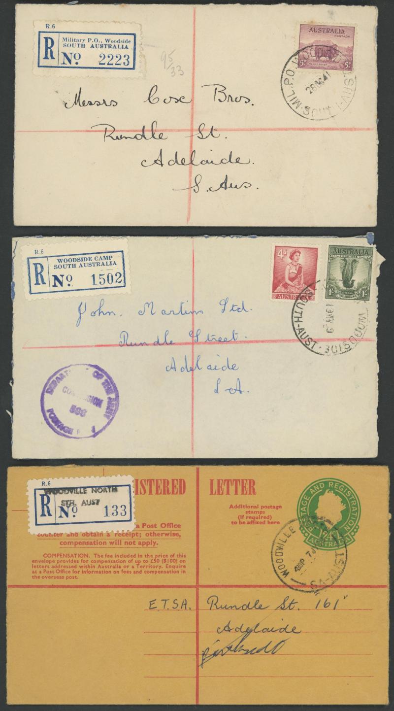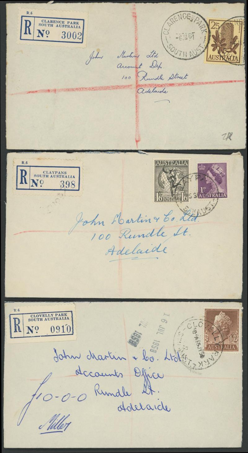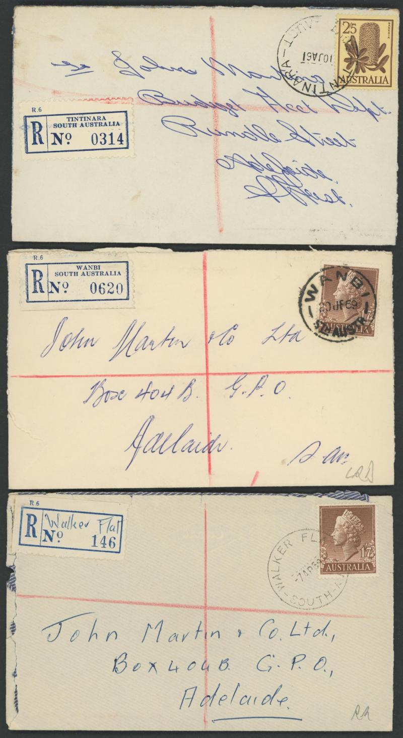 (SDL; the only recorded date), 'WHYALLA GEORGE AVENUE', 1937 'WAARACHIE', 1965 'WARRADALE/ 2 ', 1940 'WOKURNA', etc, many early provisional & makeshift R labels, mostly to large mail order companies with a high percentage opened-out. An exceptional