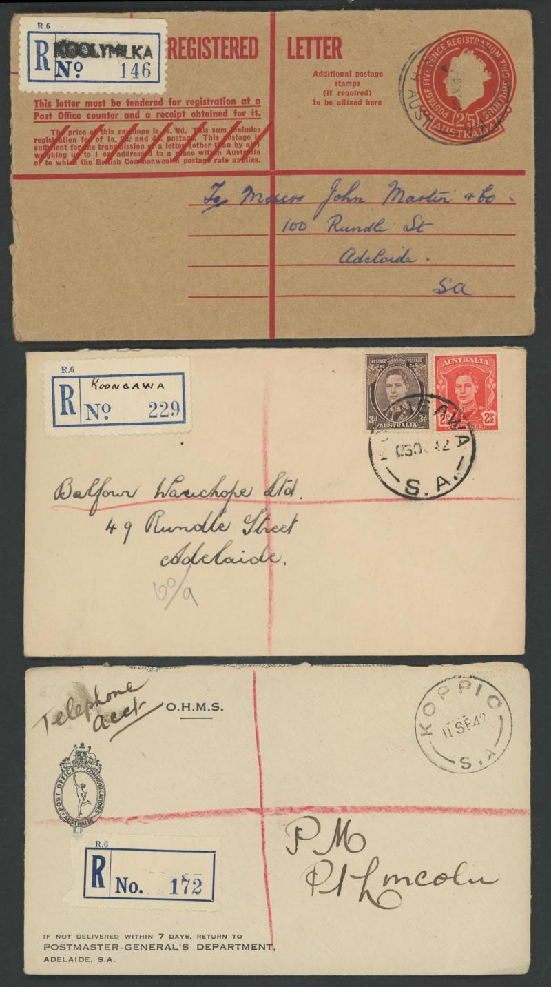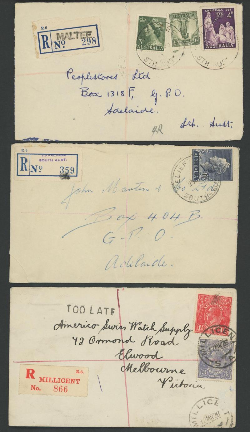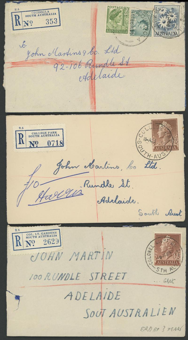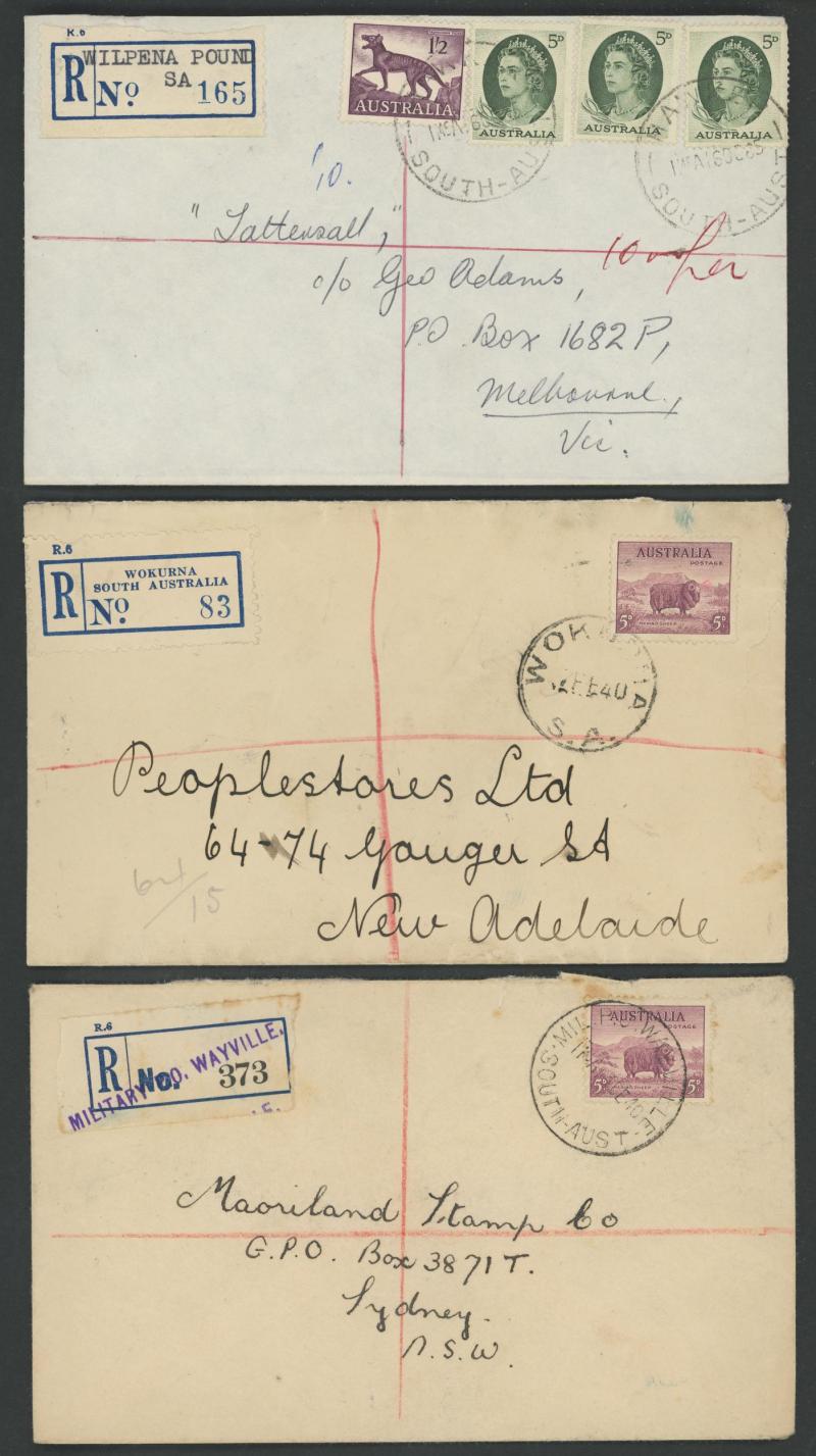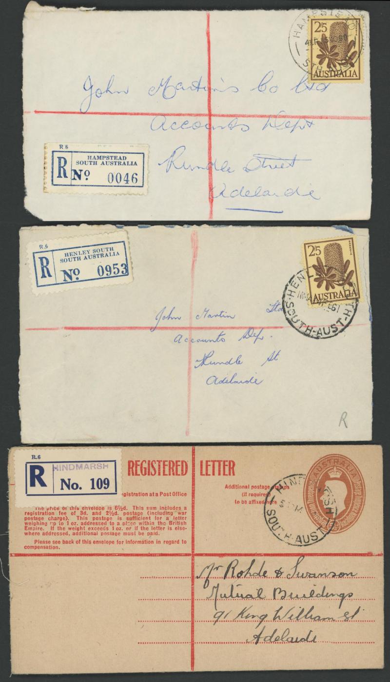(SDL; the only recorded date), 'WHYALLA GEORGE AVENUE', 1937 'WAARACHIE', 1965 'WARRADALE/ 2 ', 1940 'WOKURNA', etc, many early provisional & makeshift R labels, mostly to large mail order companies with a high percentage opened-out. An exceptional