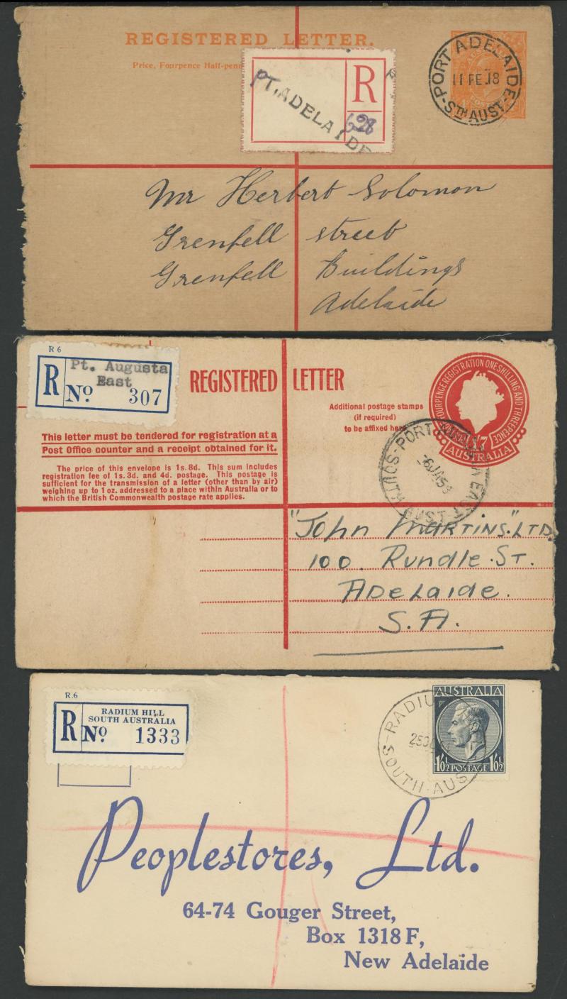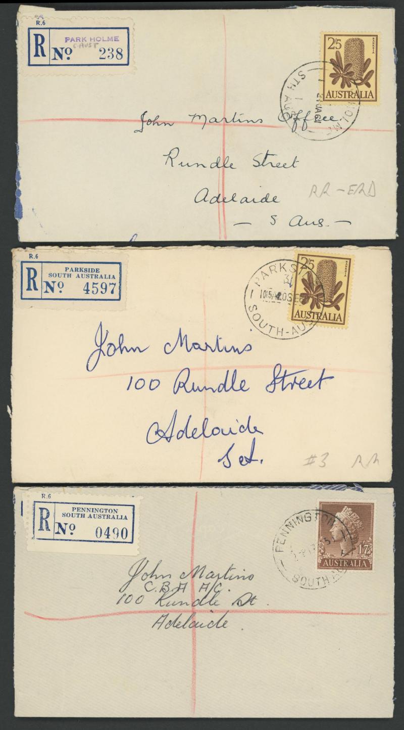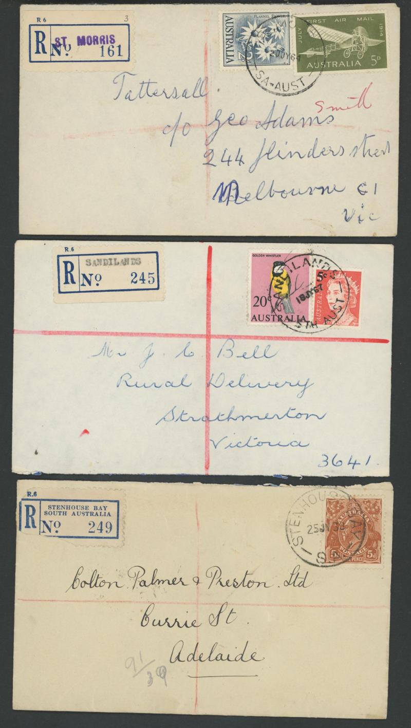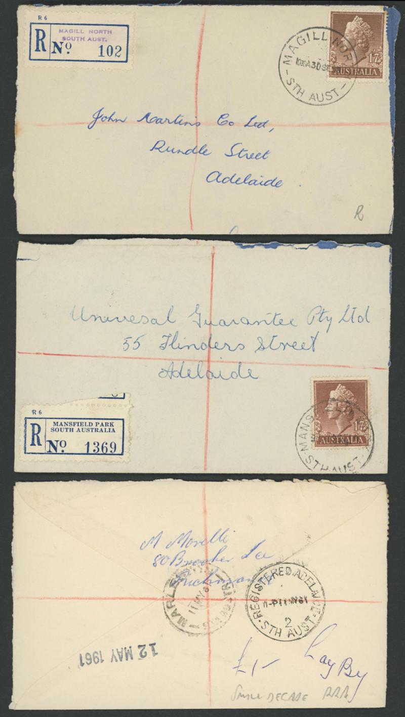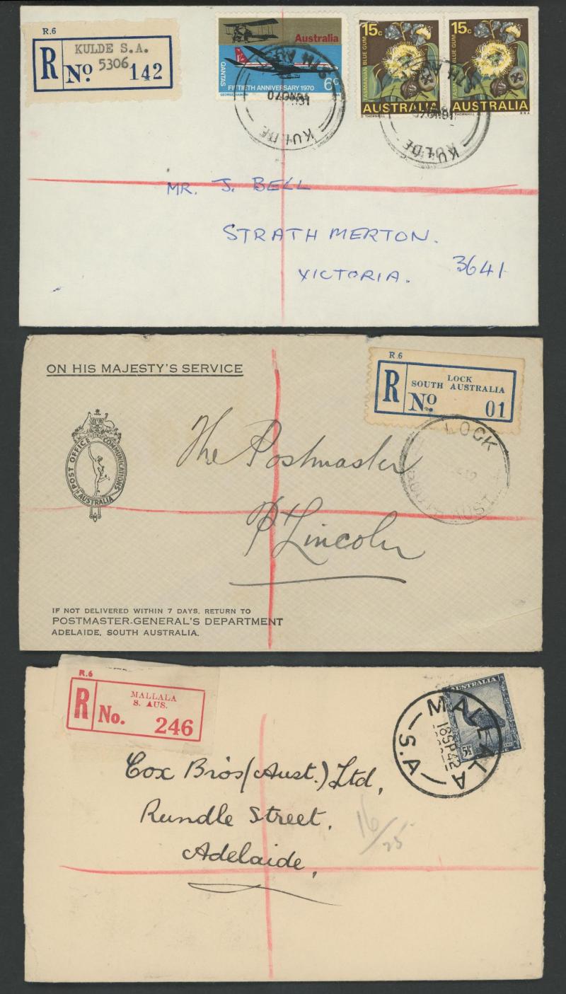 (SDL; the only recorded date), 'WHYALLA GEORGE AVENUE', 1937 'WAARACHIE', 1965 'WARRADALE/ 2 ', 1940 'WOKURNA', etc, many early provisional & makeshift R labels, mostly to large mail order companies with a high percentage opened-out. An exceptional