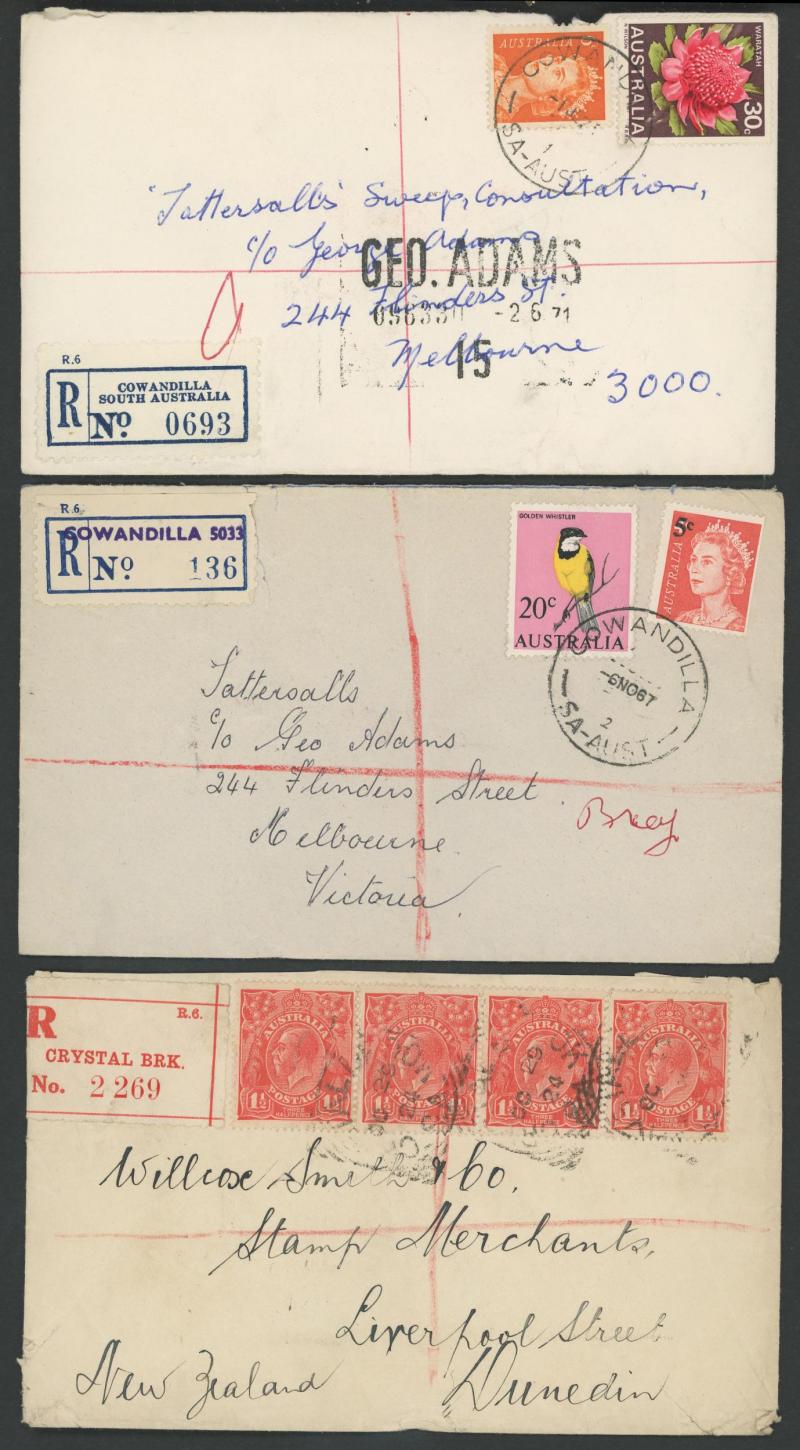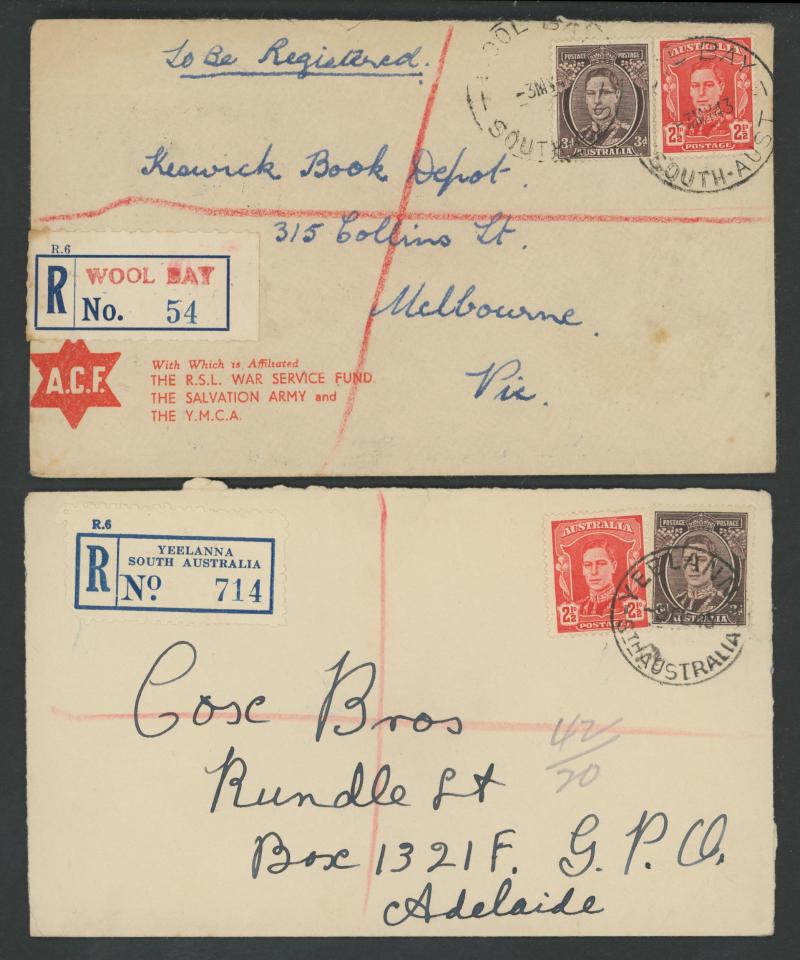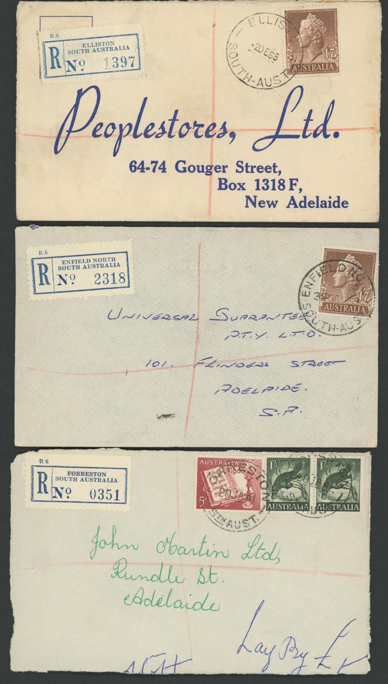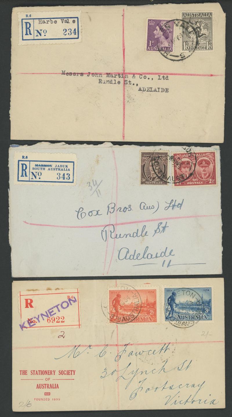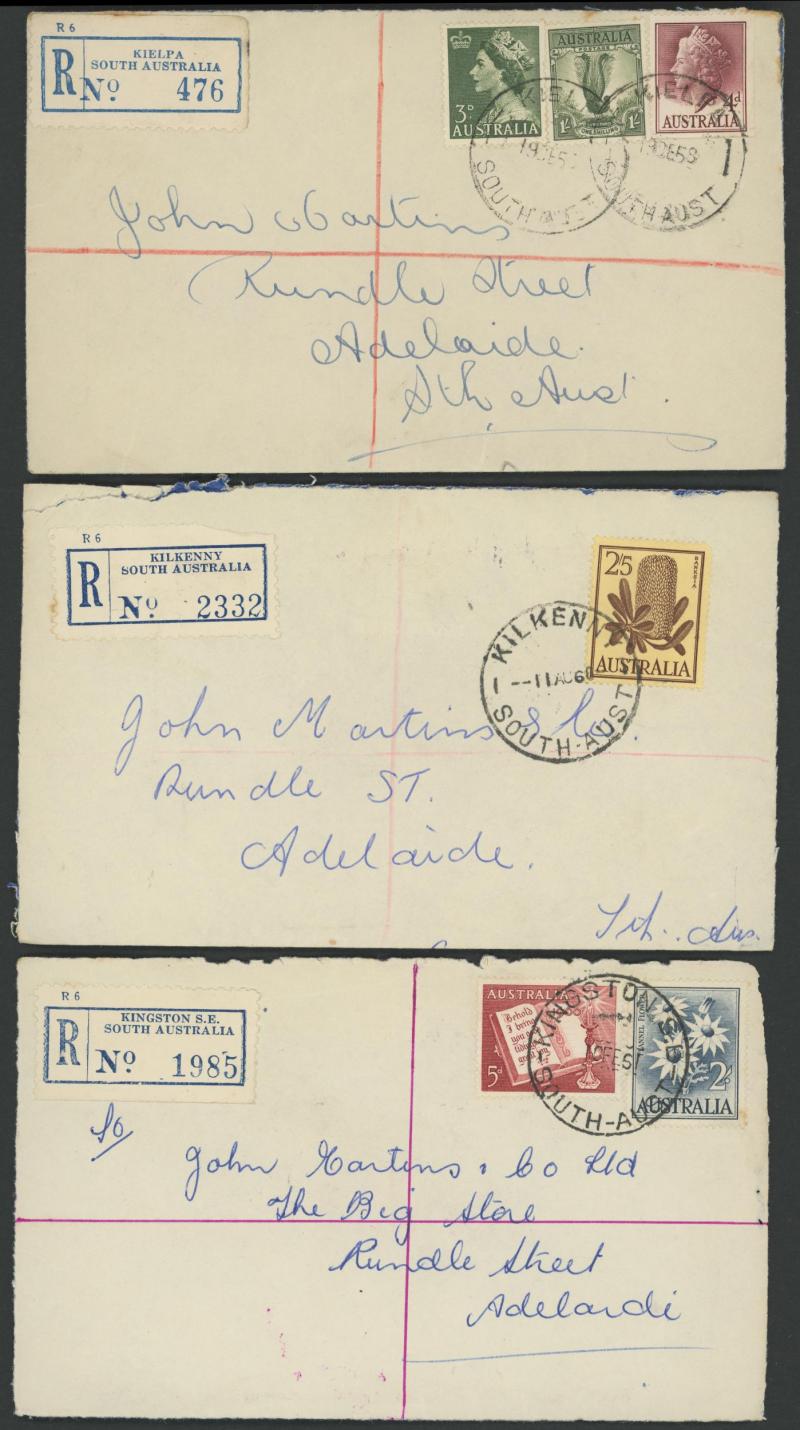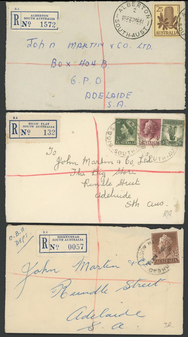 (SDL; the only recorded date), 'WHYALLA GEORGE AVENUE', 1937 'WAARACHIE', 1965 'WARRADALE/ 2 ', 1940 'WOKURNA', etc, many early provisional & makeshift R labels, mostly to large mail order companies with a high percentage opened-out. An exceptional